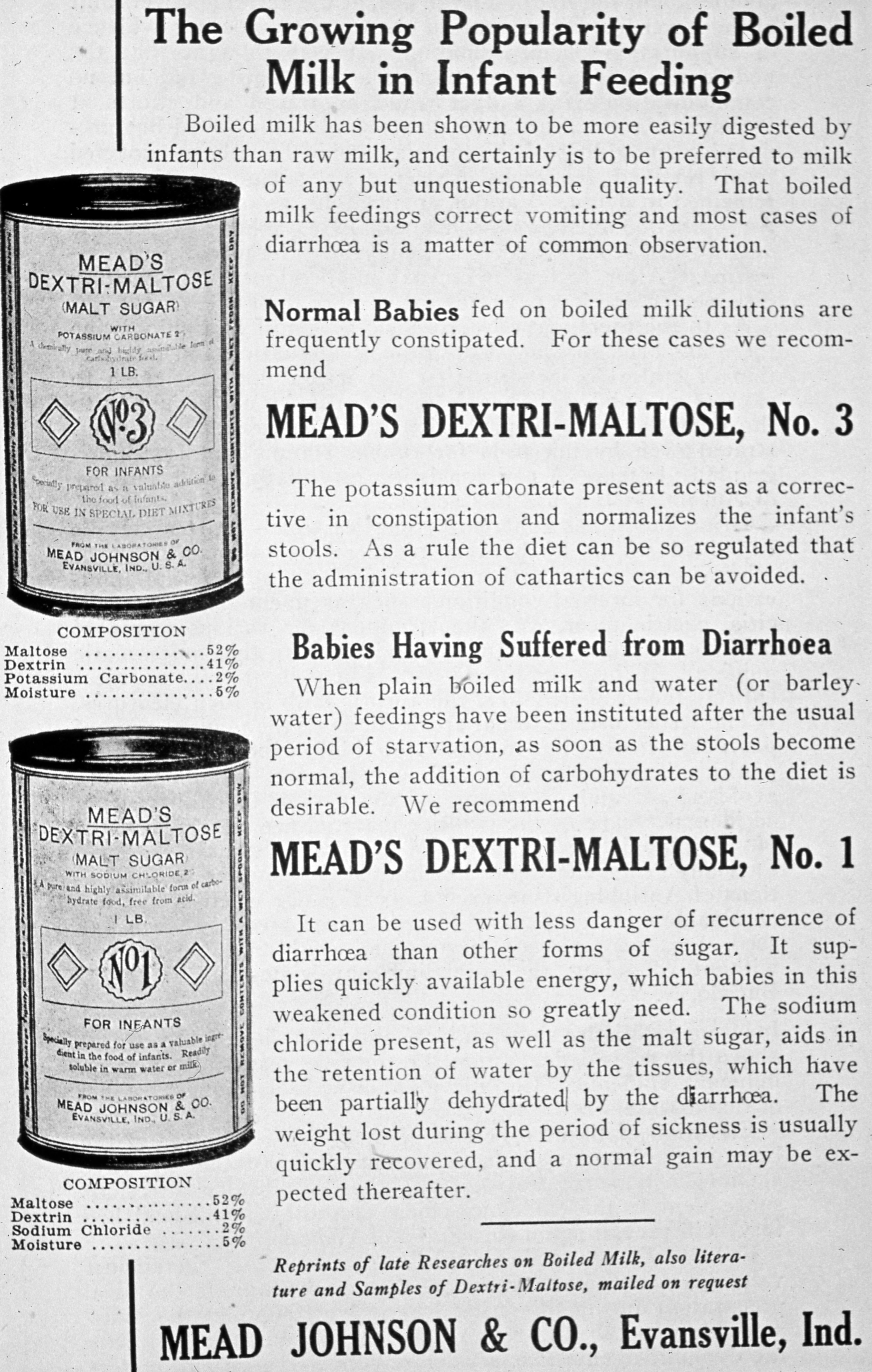Advertisement in the Archives of Pediatrics from 1918 for Mead Johnson's Dextri-Maltose product, promoting the growing popularity of boiled milk in infant feeding