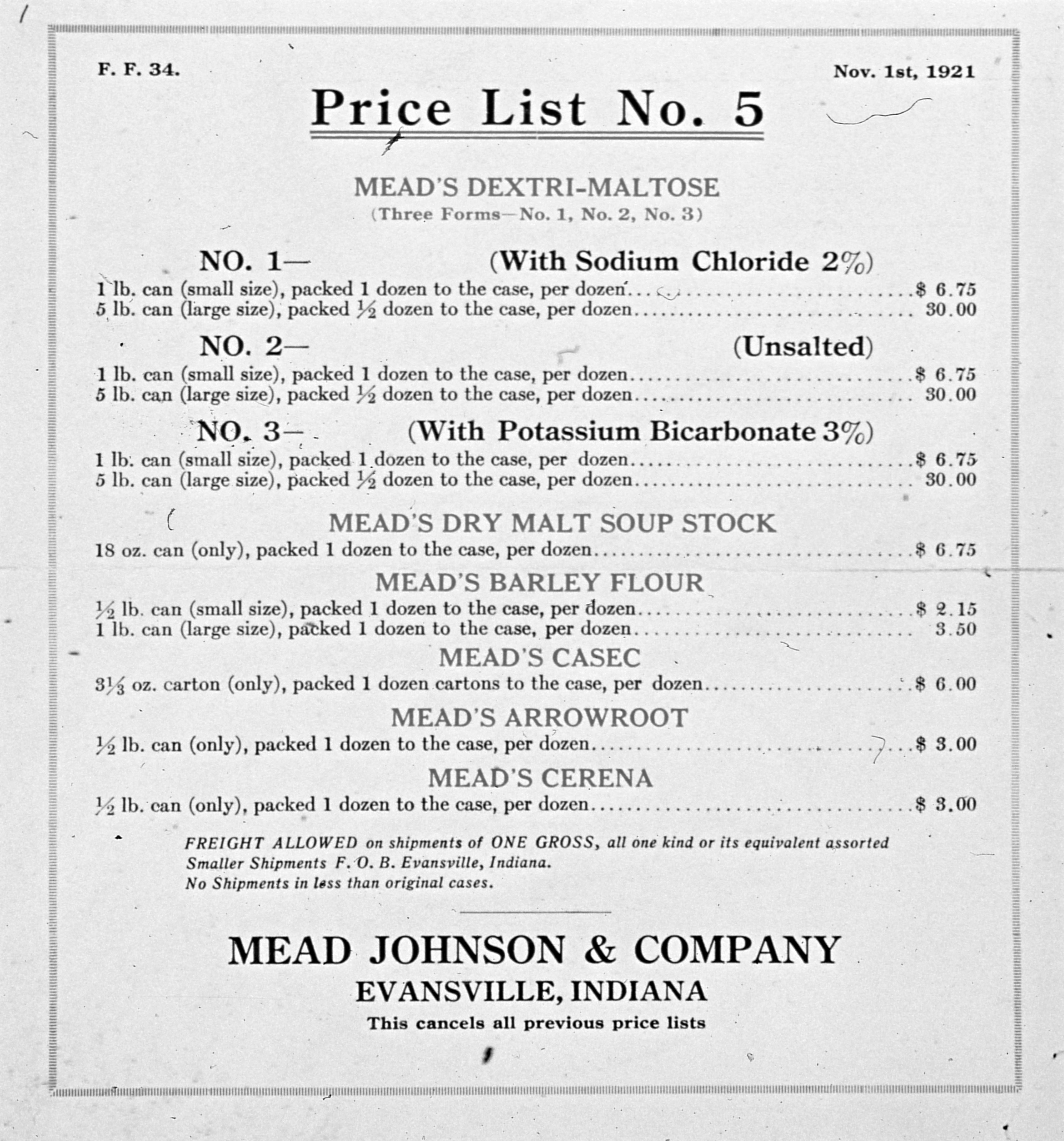 Mead's Infant Diet Materials price list no. 5, with actual prices
