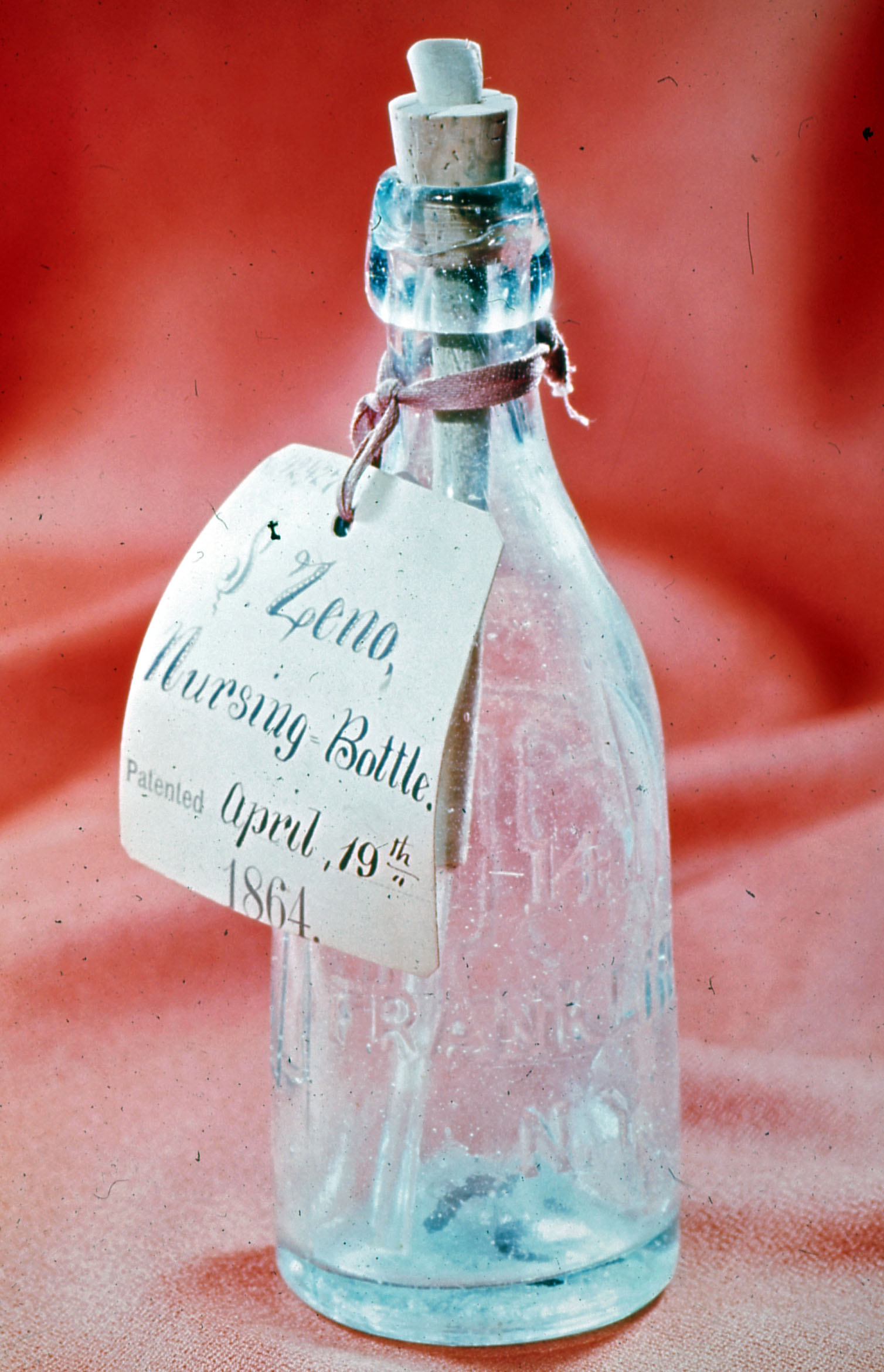 Antique pediatric nurser made of glass with a cork stopper. The attached sign says it is a S. Zeno Nursing Bottle, patented April 19, 1864.