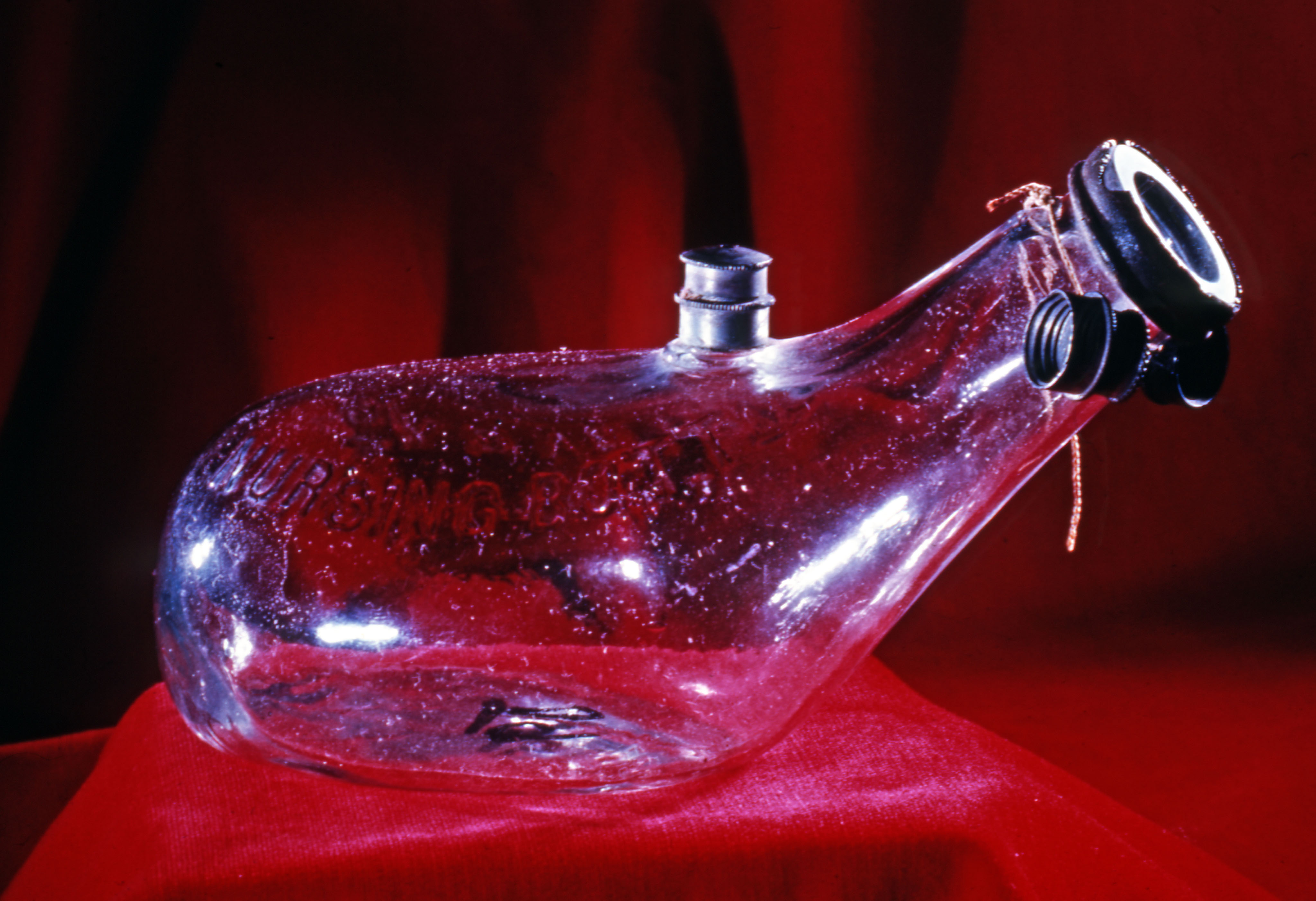 Antique pediatric nurser. Glass feeding bottle with metal caps