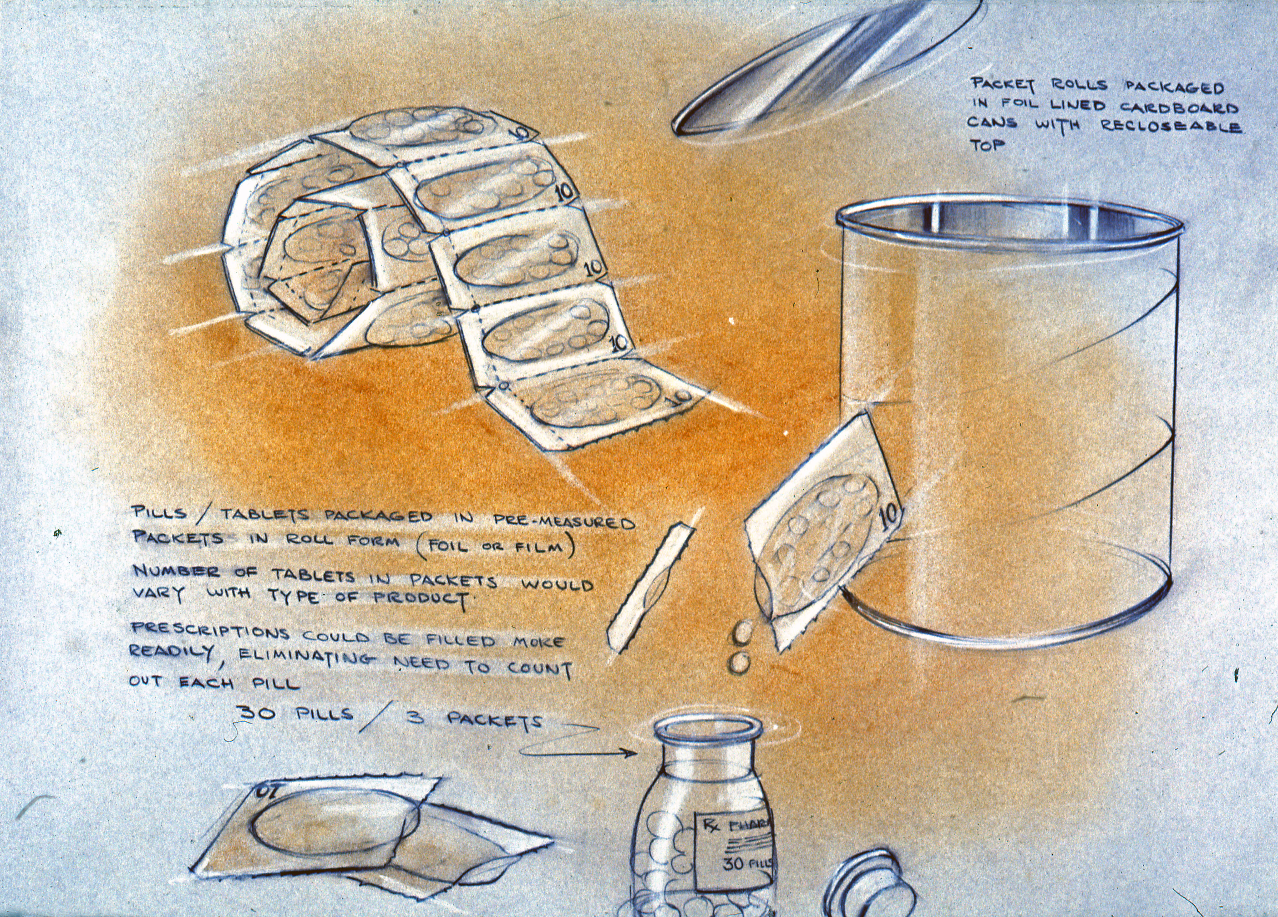 Business presentation on physical packaging: drawing of packaging for products in pill format