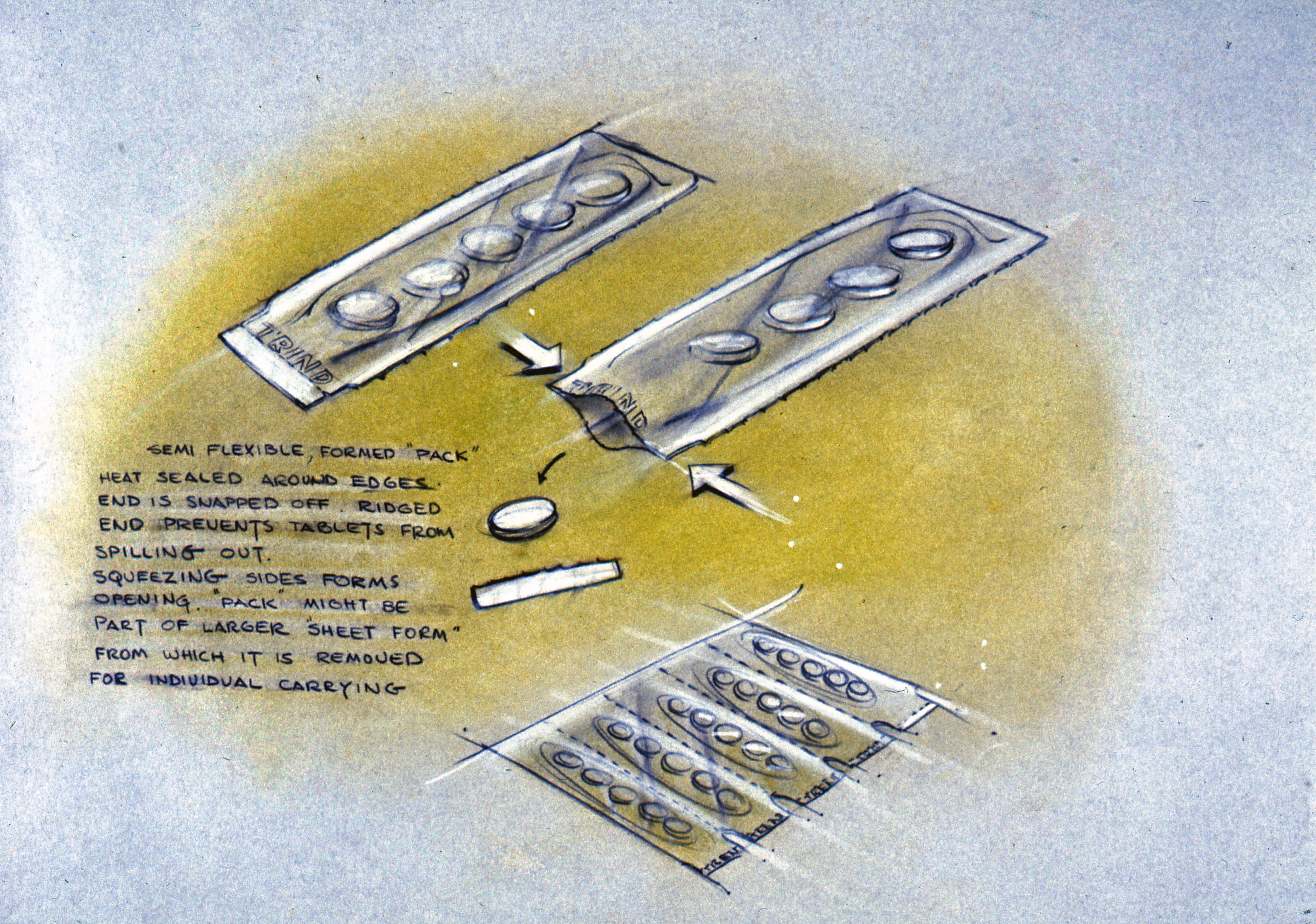 Business presentation on physical packaging: drawing of small packs of tablets
