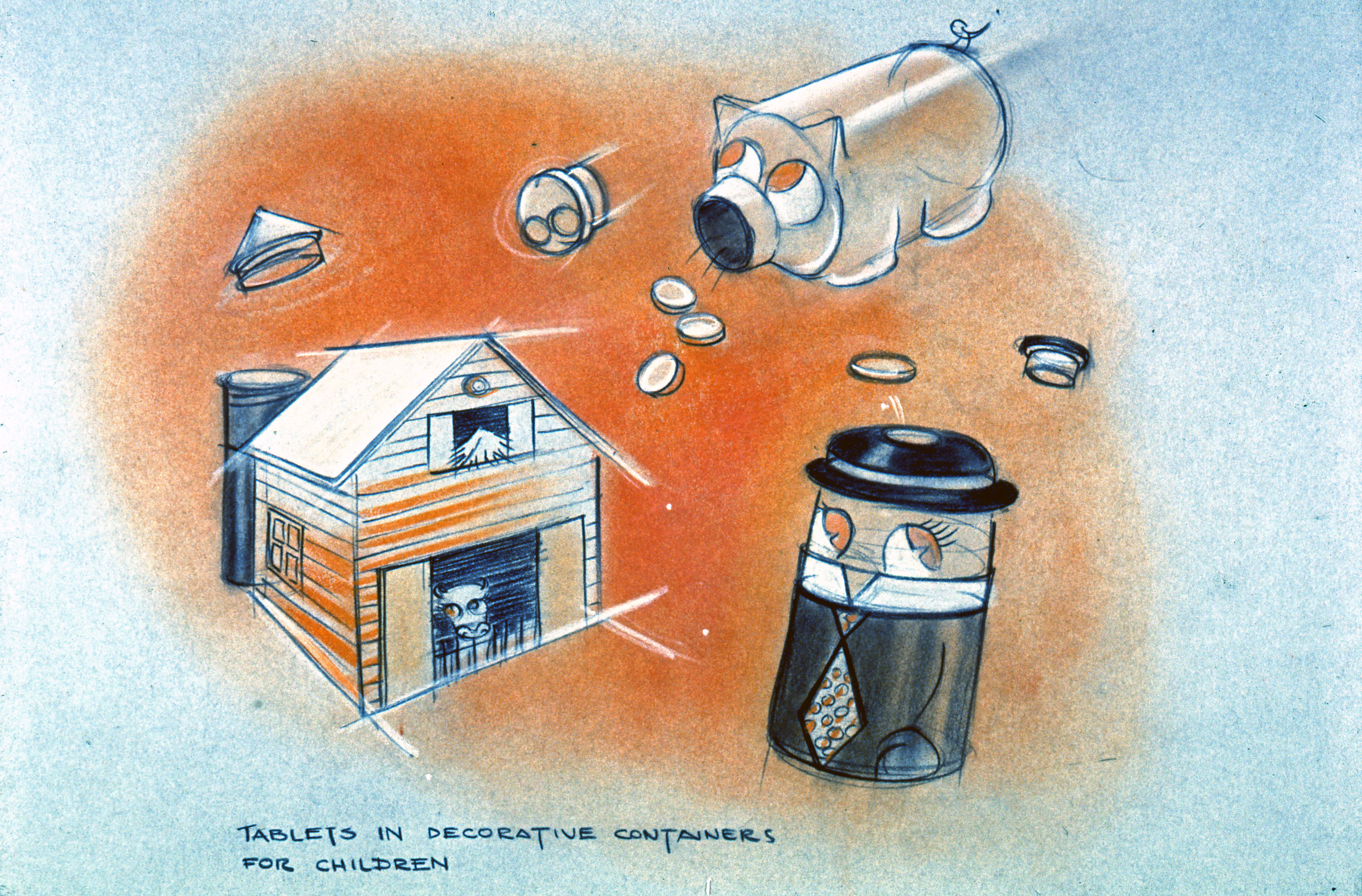 Business presentation on physical packaging: drawing of tablets in fun shaped packages for children
