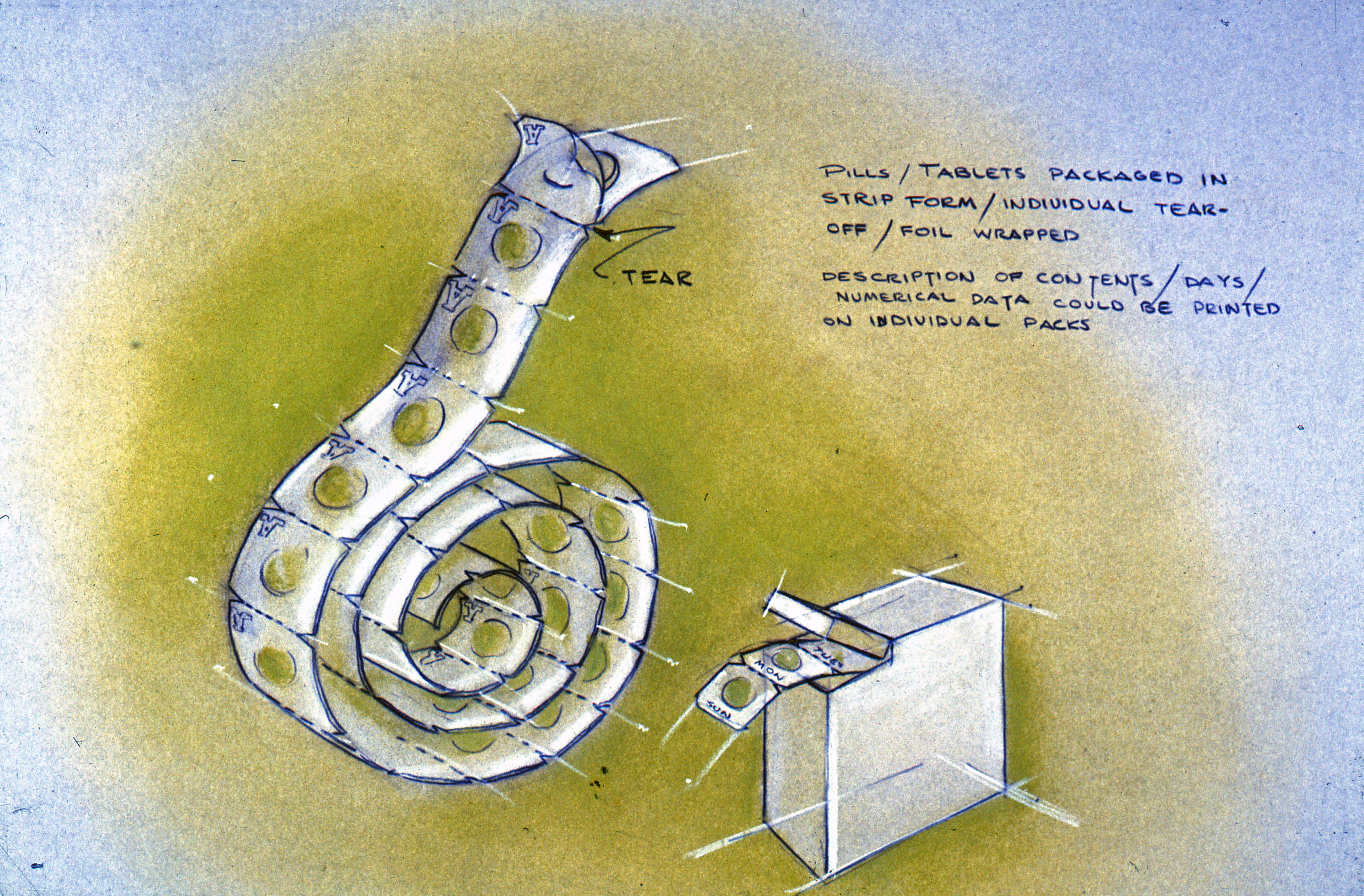Business presentation on physical packaging: drawing of container for pills and tablets in strip format
