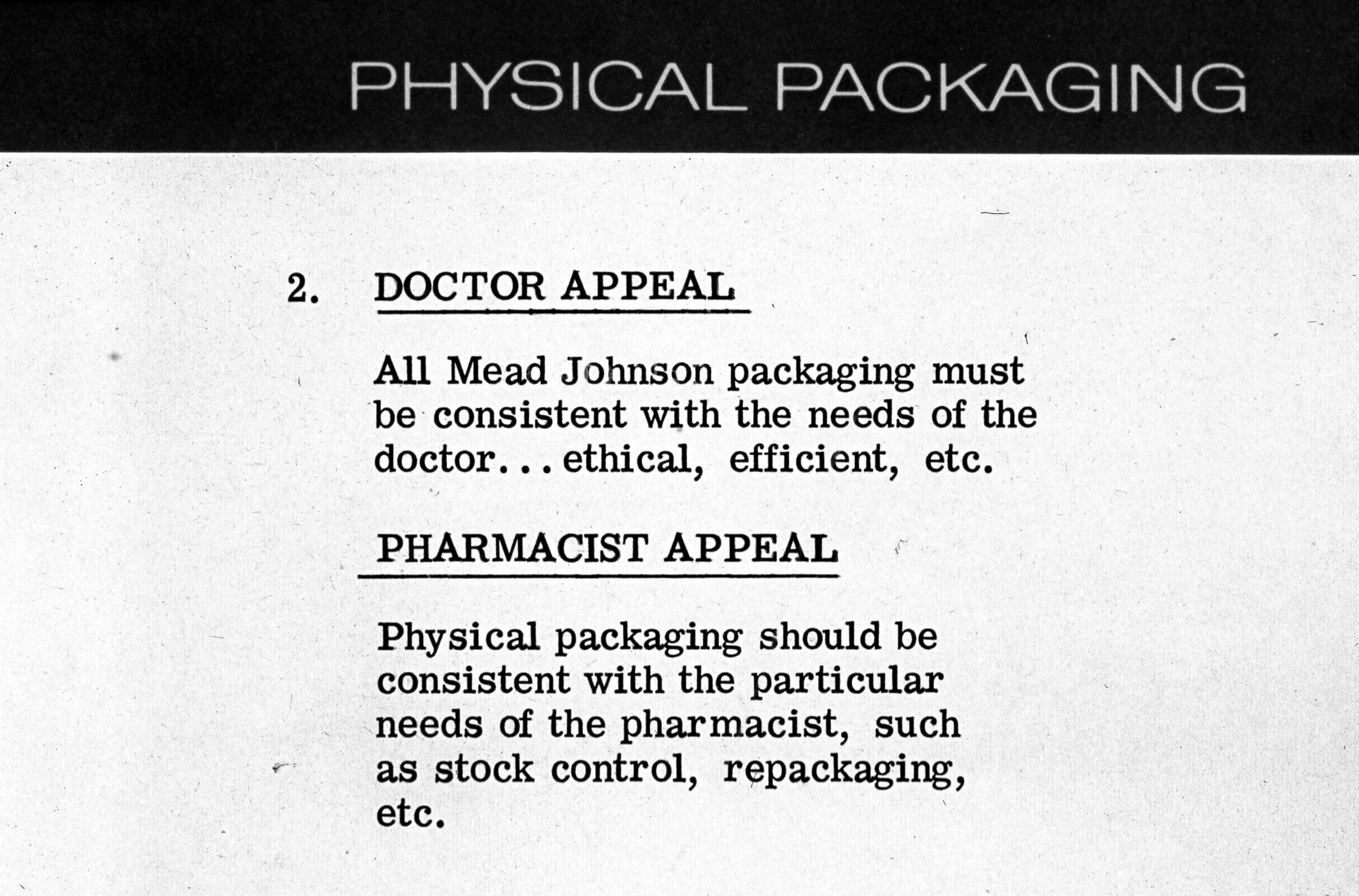 Business presentation on physical packaging: text explaining doctor and pharmacist appeal