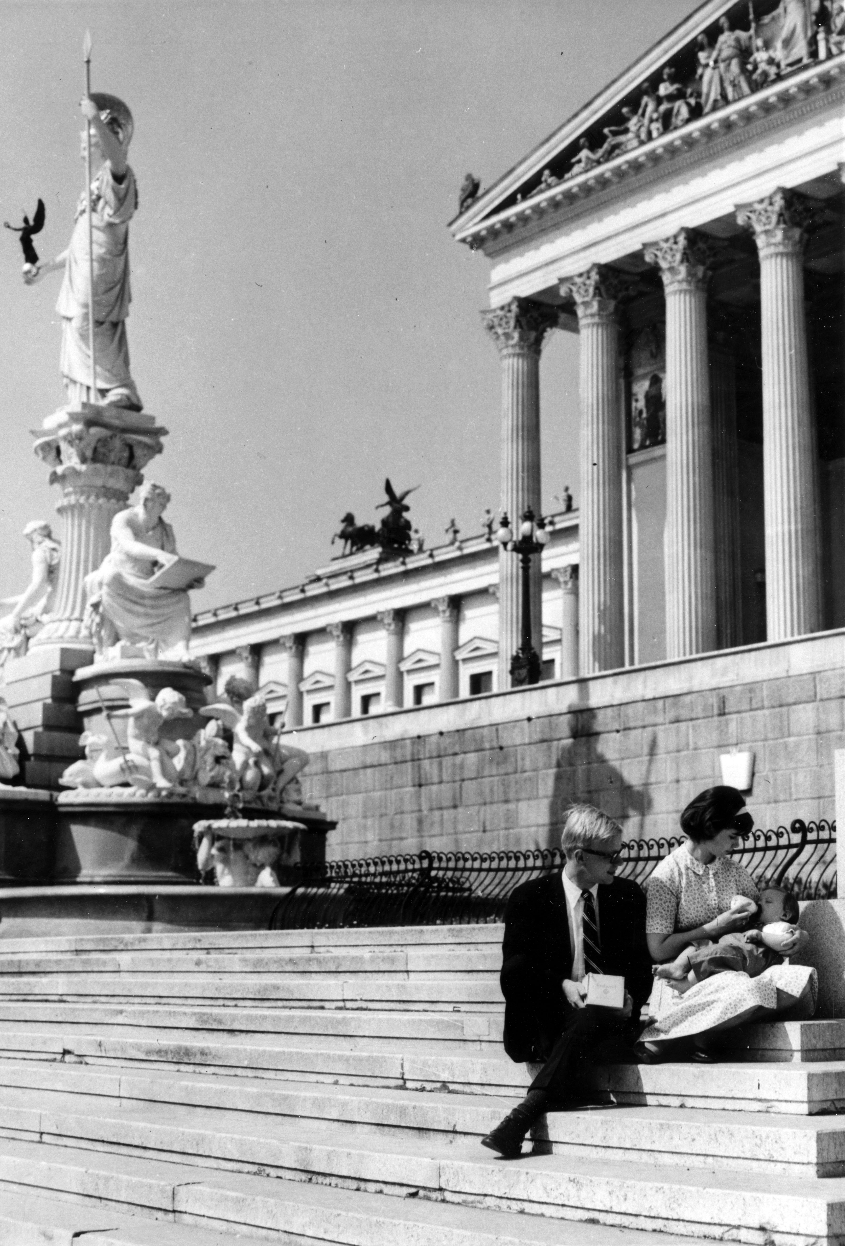 The Donnelly family posing for Enfamil advertisement and promotional photos, feeding baby on the steps of the Parliament Building