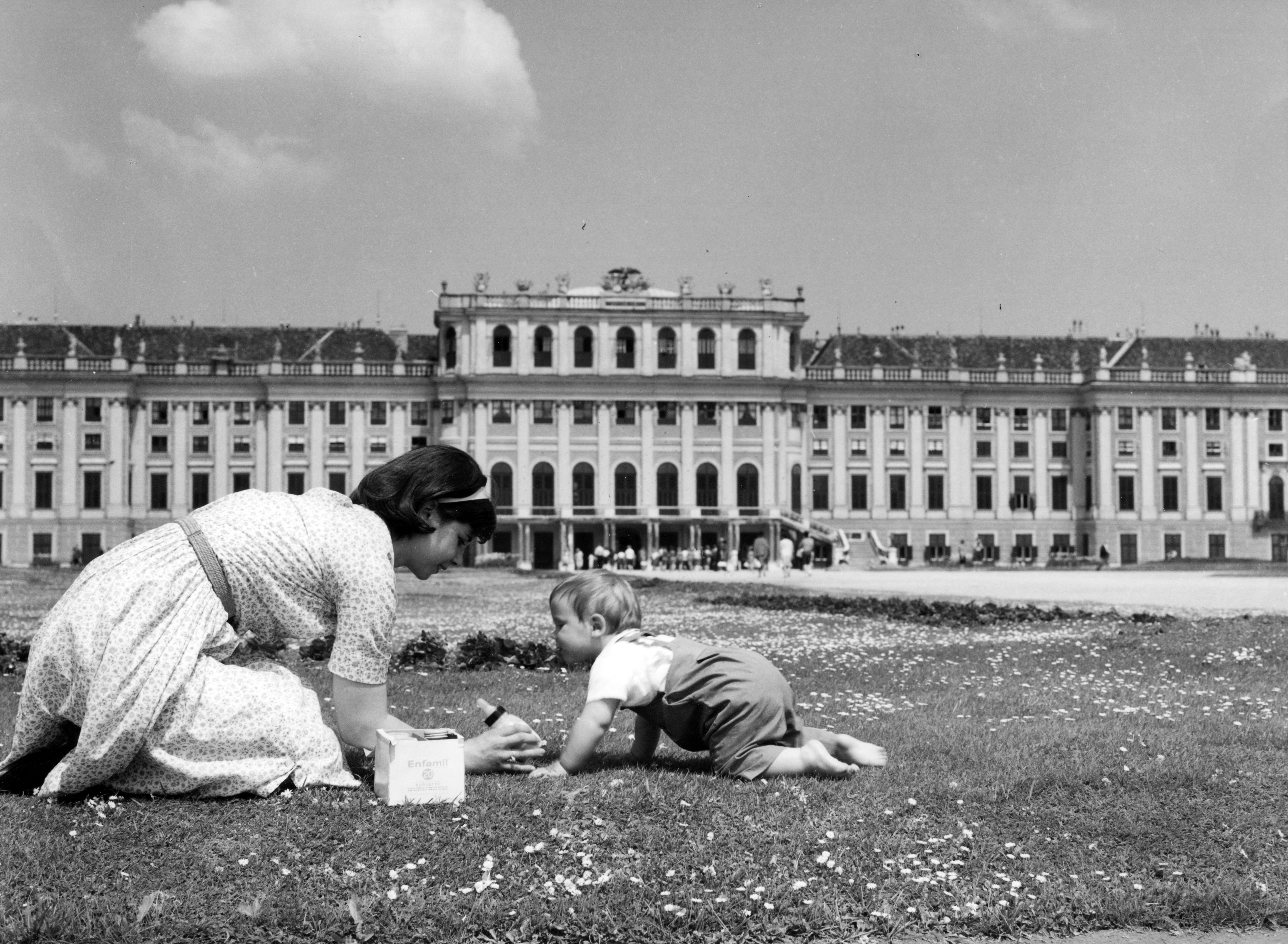 The Donnelly family posing for Enfamil advertisement and promotional photos, with the mother and baby on the grounds of the Schonbruun Palace.