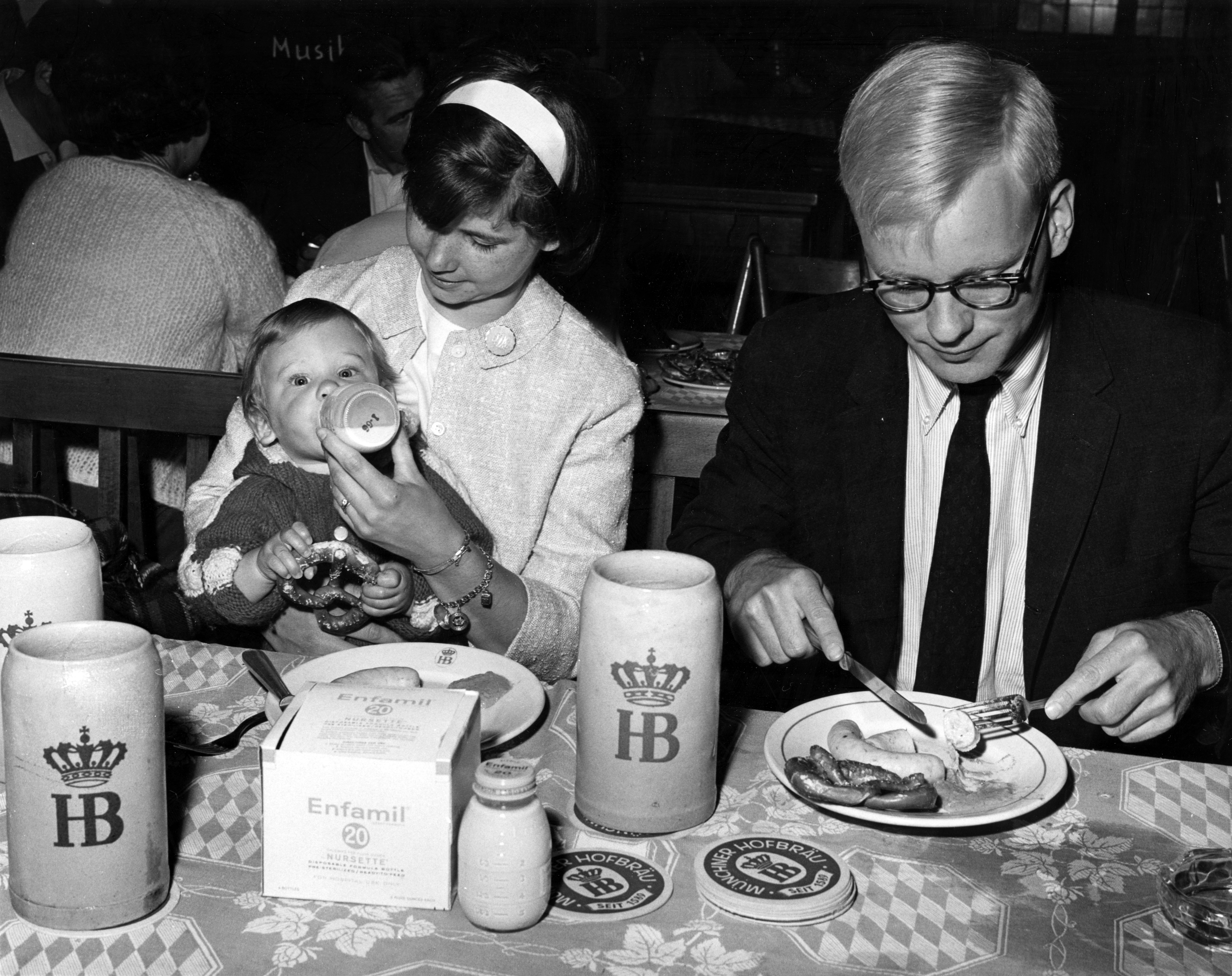 The Donnelly family posing for Enfamil advertisement and promotional photos, with the family at the Hofbrau Munchen brewery.