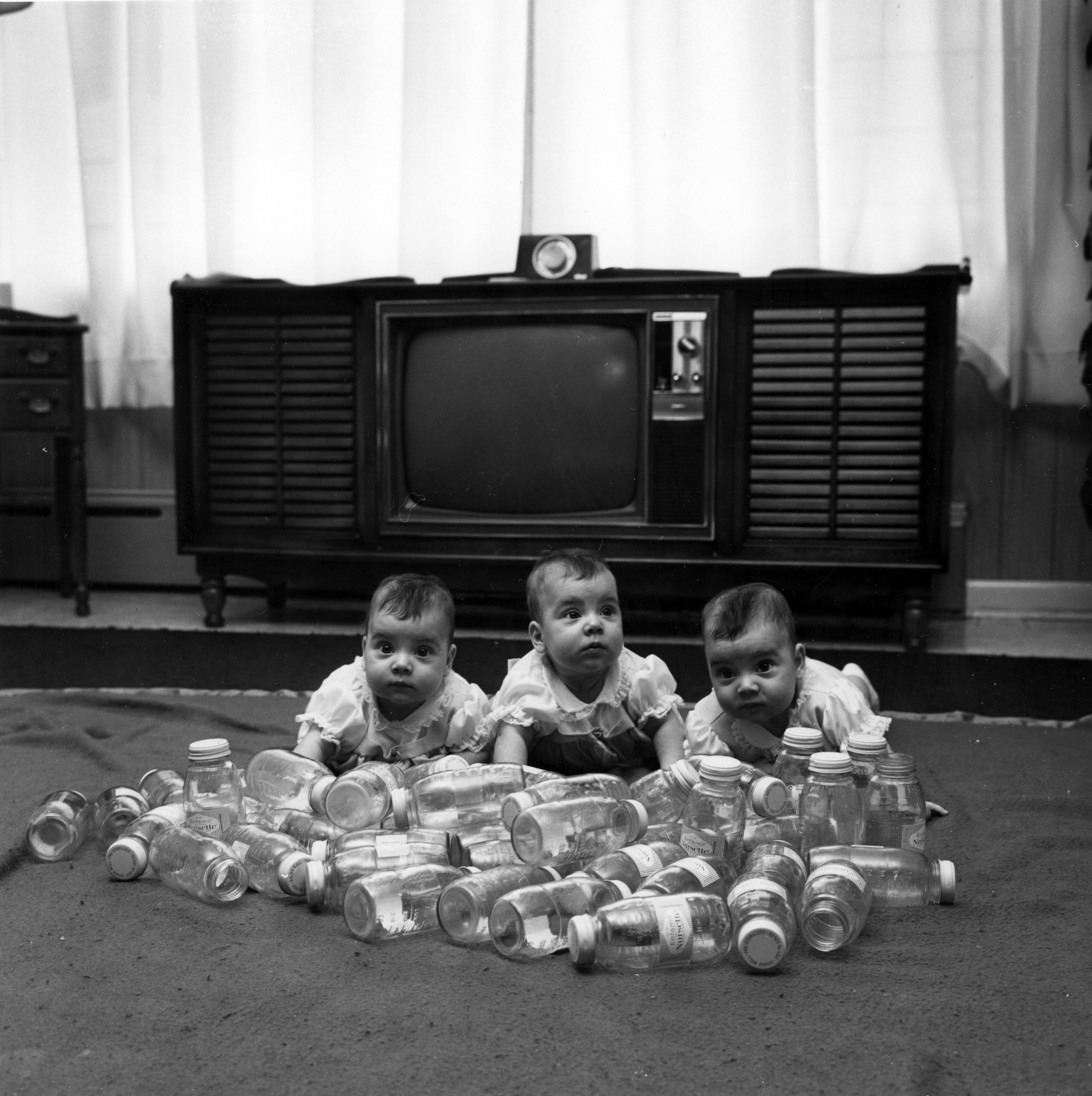 Anita Giordano, Marie Giordano, and Gina Giordano surrounded by empty bottles, probably of Enfamil.