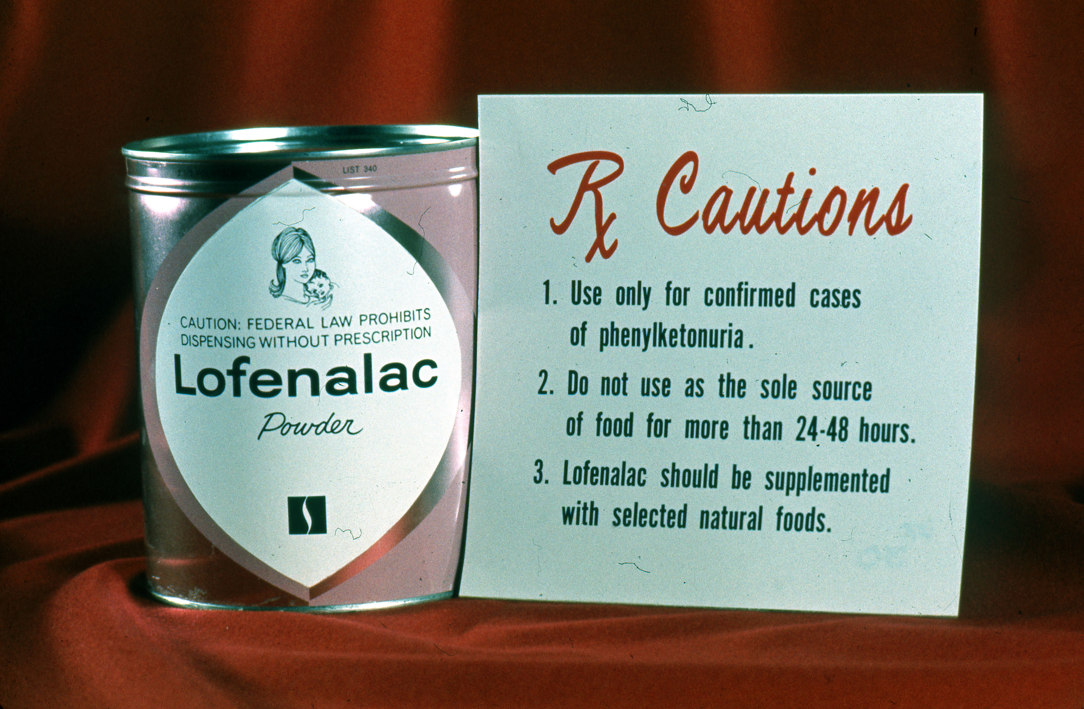 Can of Lofenalac powder, with a list of precautions for its proper usage.