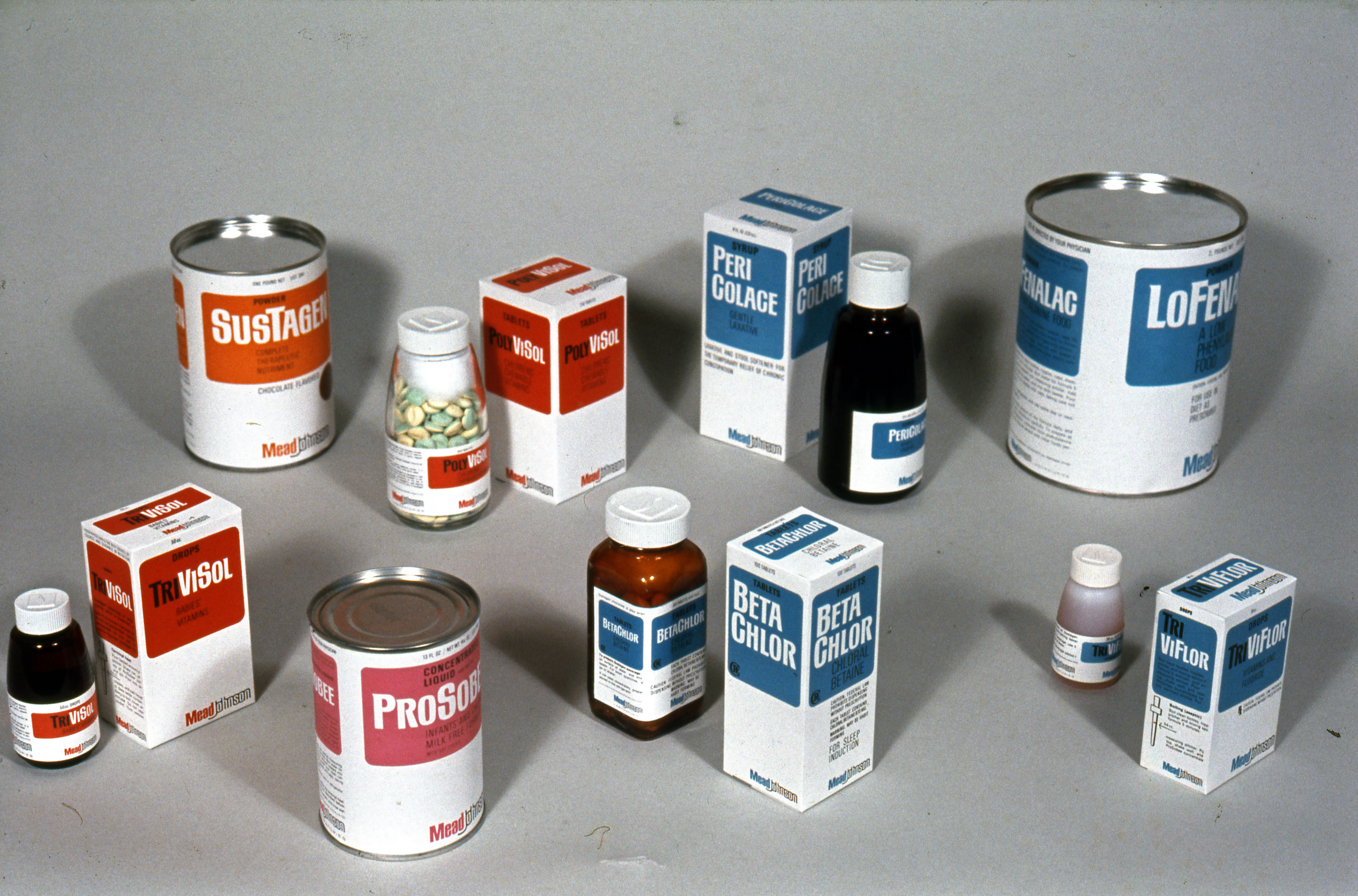 Business presentation of Mead Johnson products with red and blue labels in Evansville, Indiana
