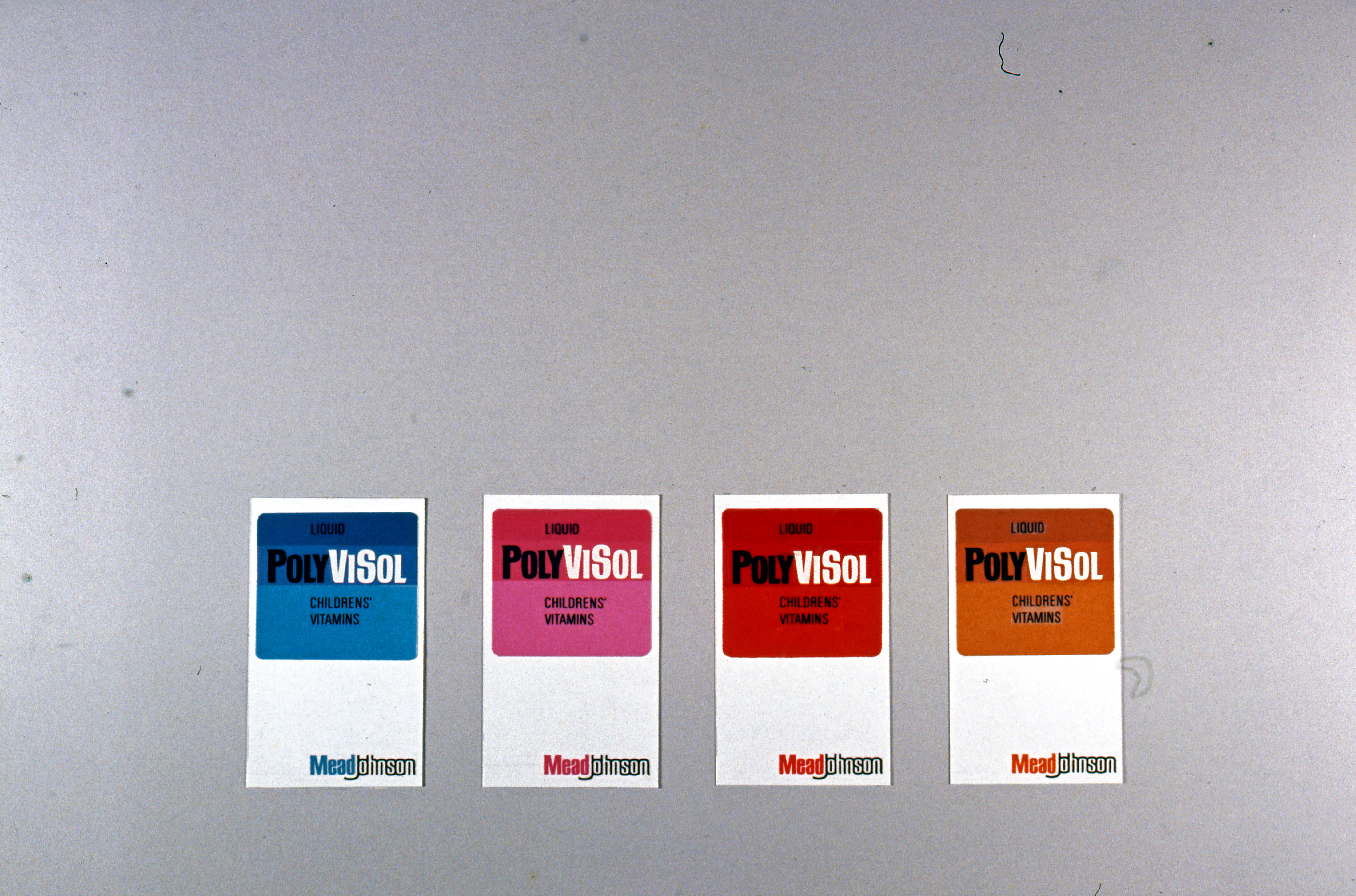Business presentation of Mead Johnson product labels in blue, pink, red, and orange in Evansville, Indiana