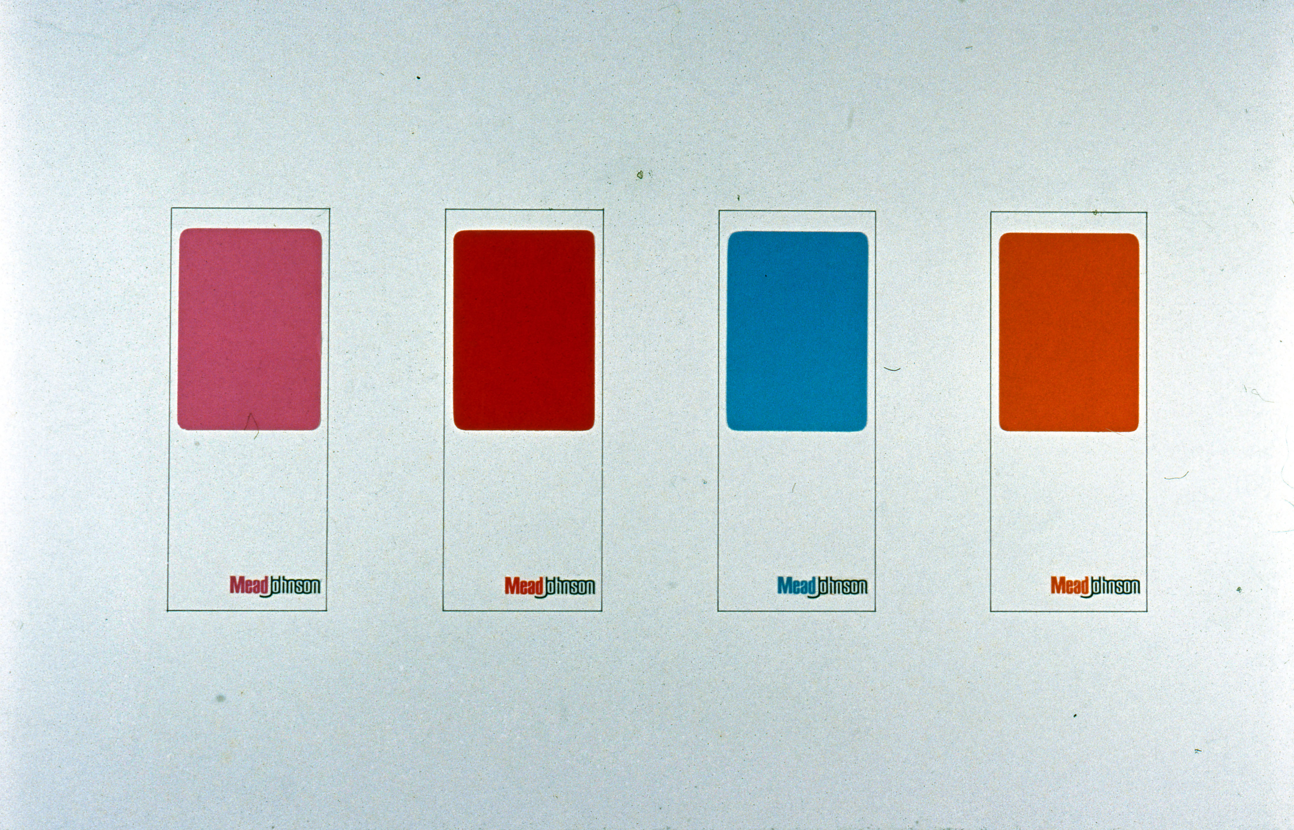 Business presentation of Mead Johnson labels in blue, pink, red, and orange in Evansville, Indiana