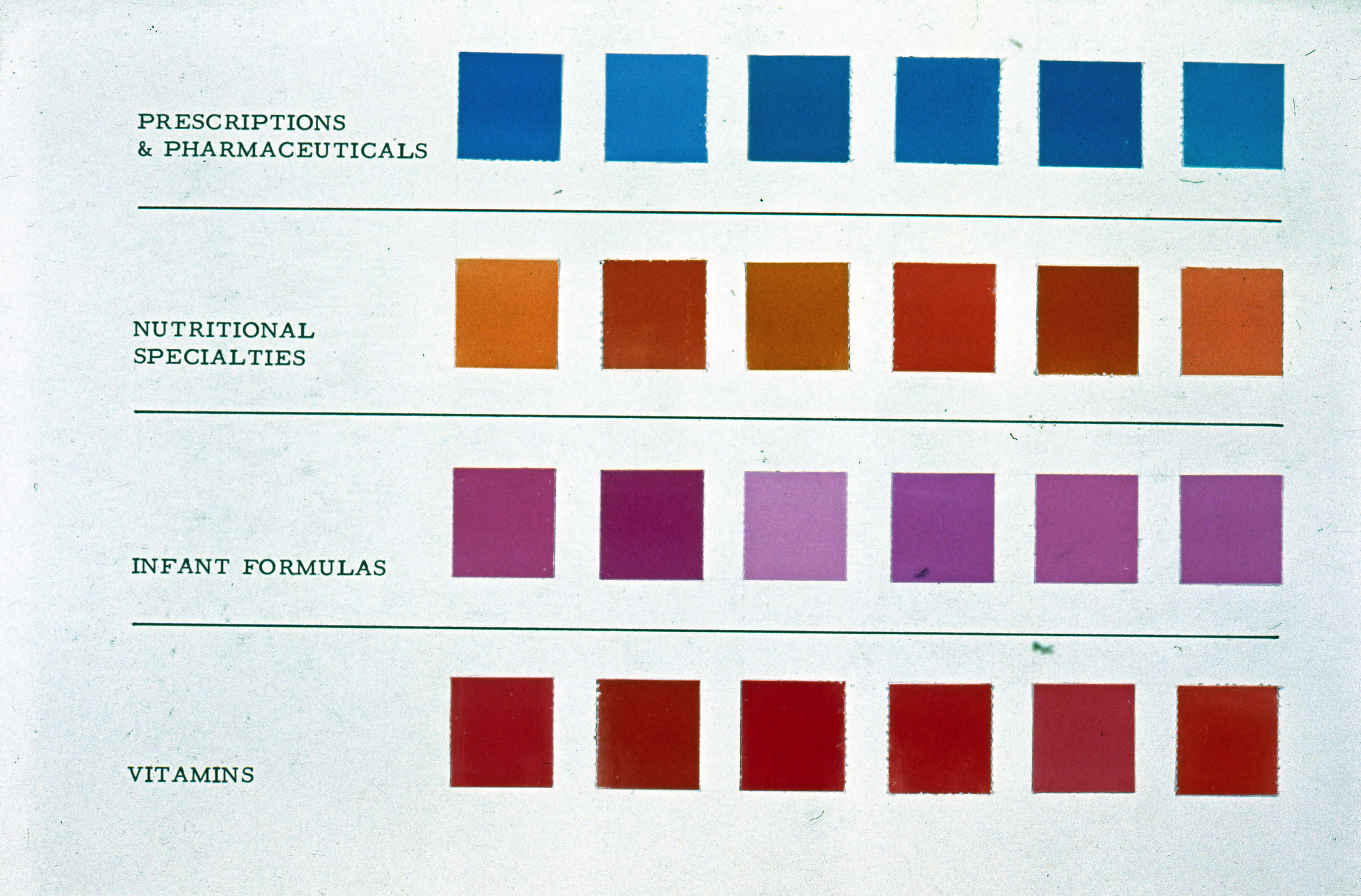 Business presentation showing different colors for different categories of Mead Johnson products: prescriptions and pharmaceuticals, nutritional specialties, infant formulas, and vitamins
