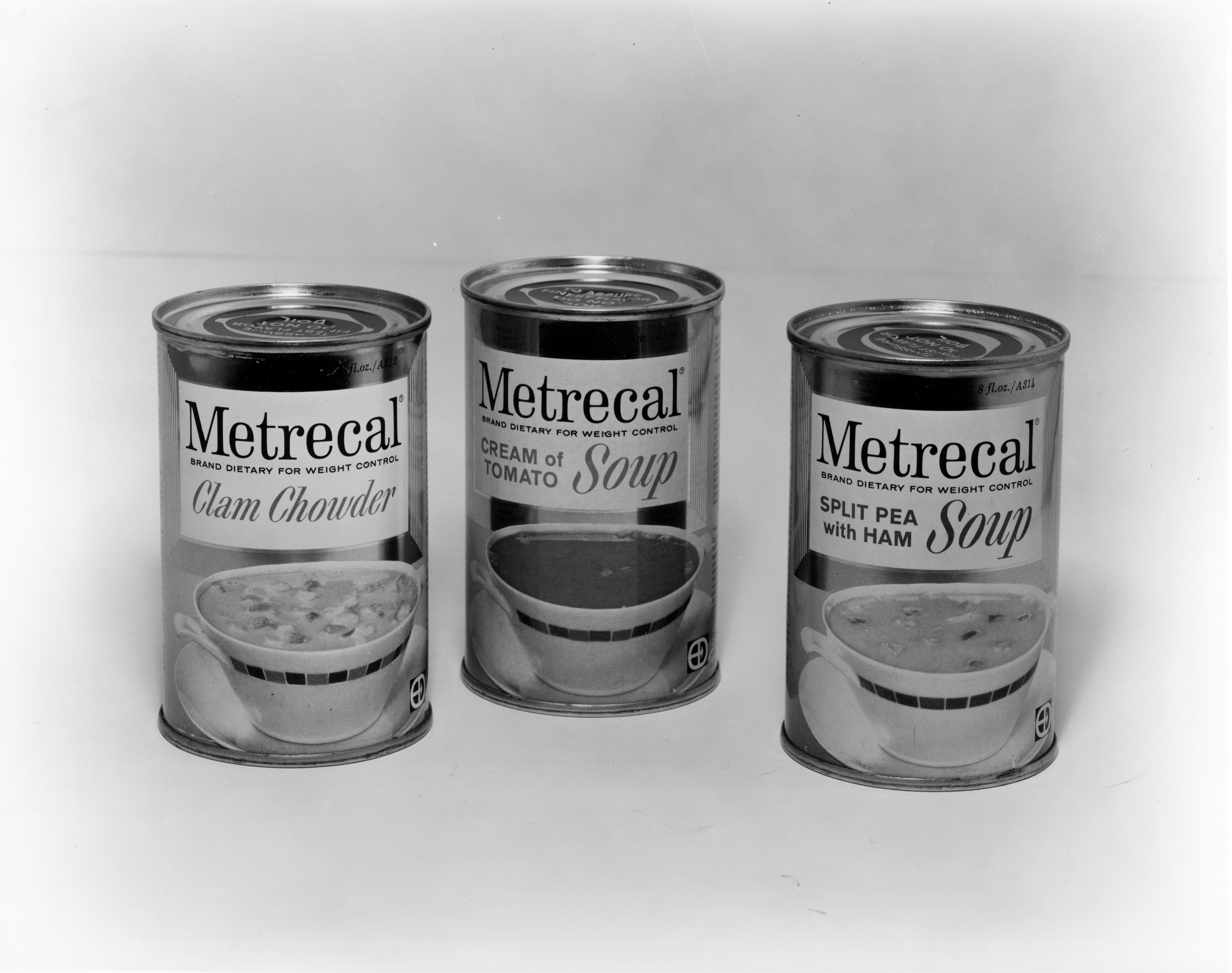 Product samples of Metrecal soups: clam chowder, cream of tomato, and split pea with ham