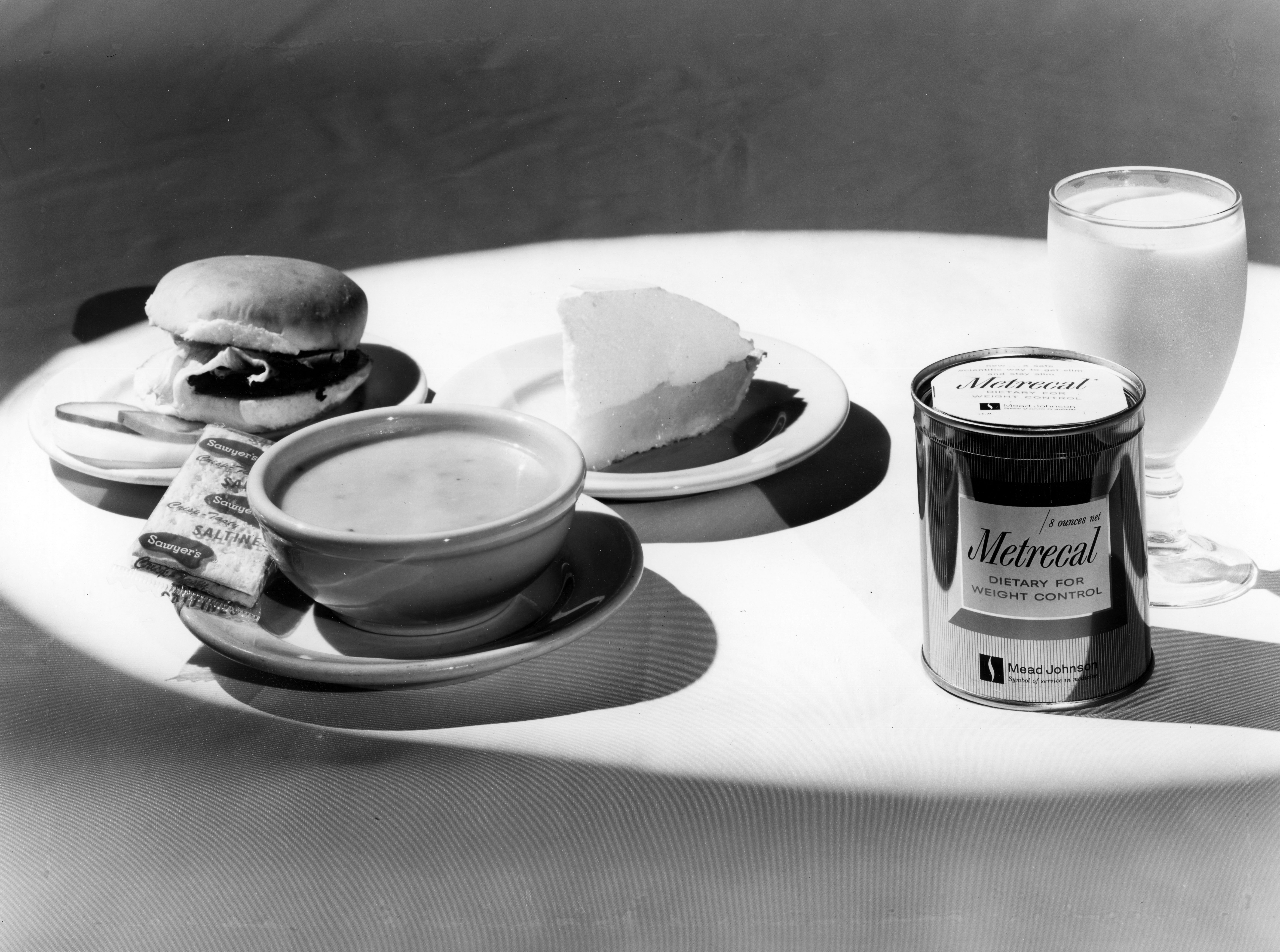 Advertisement for Mead Johnson's Metrecal, with a can of Mead Johnson's Metrecal with soup, a sandwich, and a slice of pie