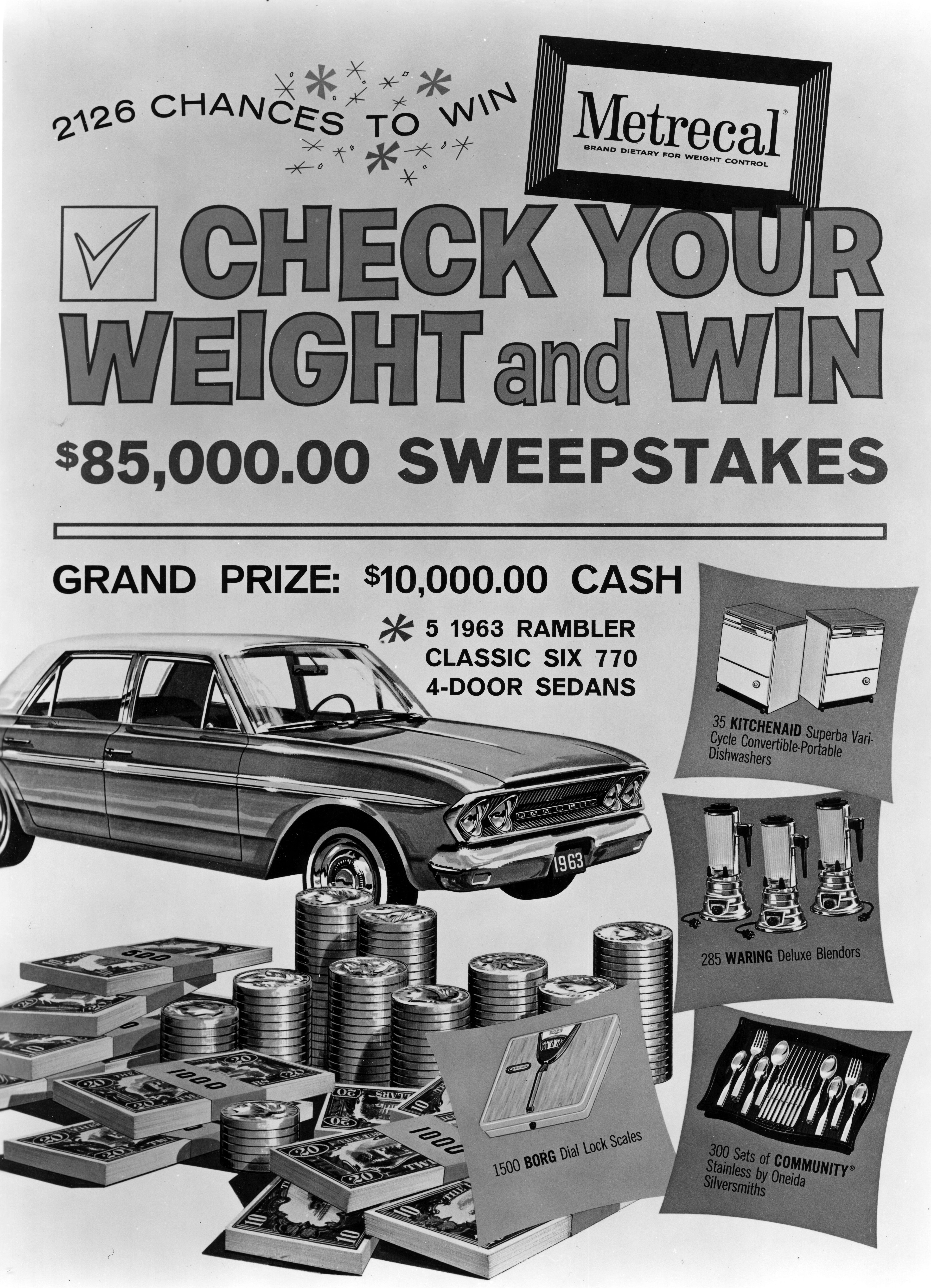 Mead Johnson advertising promotion for Metrecal: win cash prize of $10,000 or 1963 Rambler Classic six 770 4-door sedans