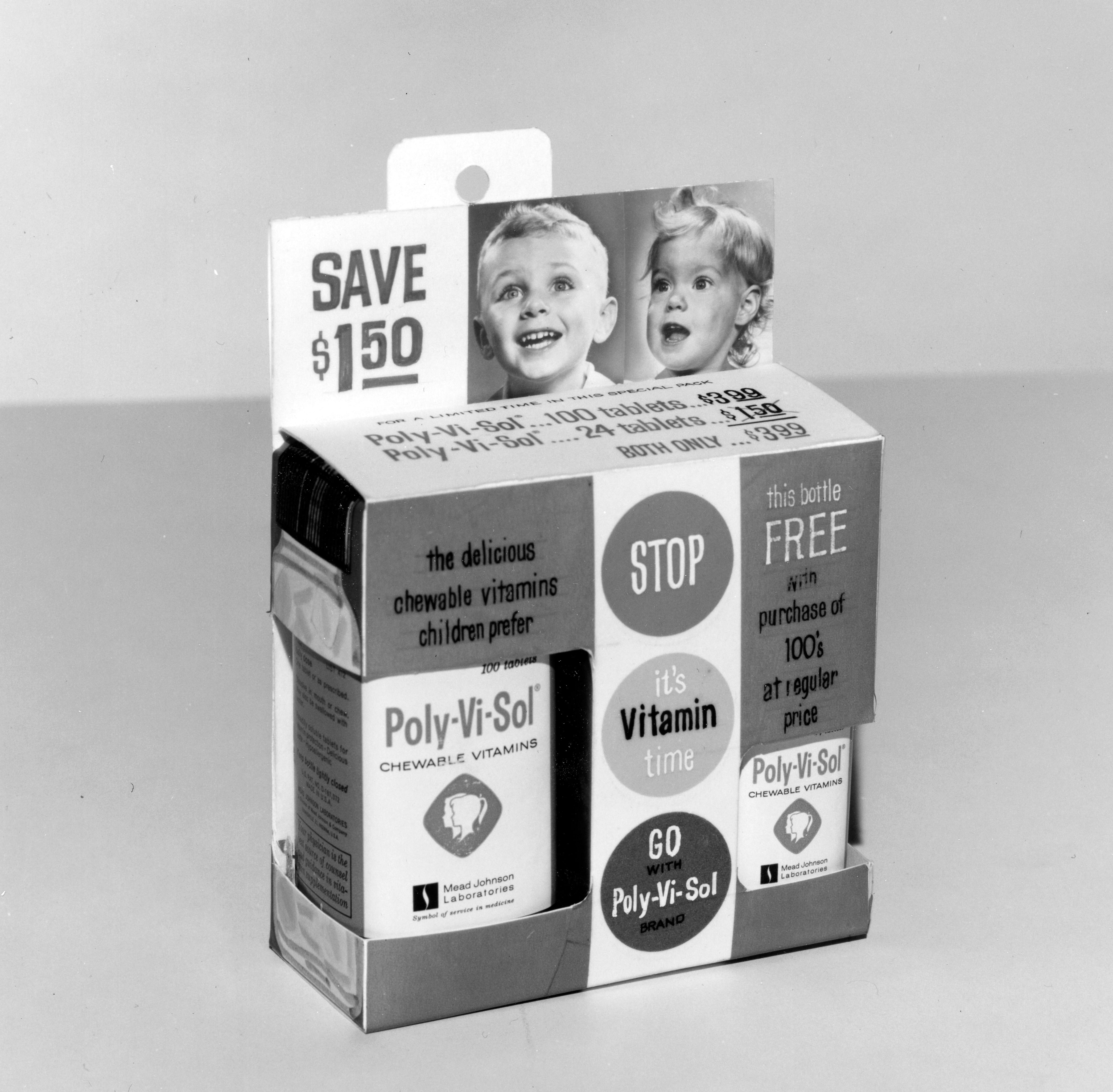 Promotional packaging to buy bottle of 100 Poly-Vi-Sol tablets and get a bottle of 24 tablets free