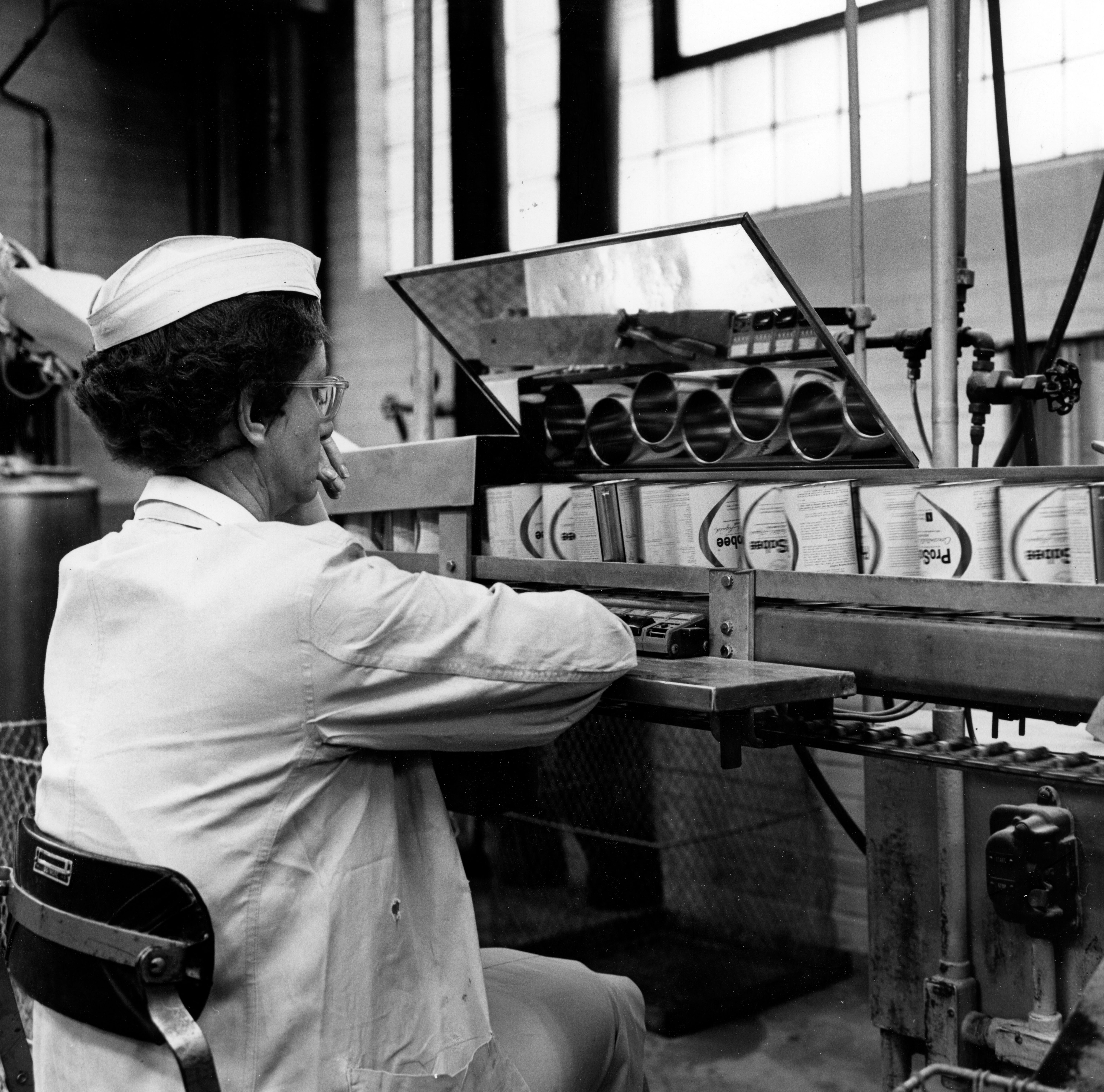 Woman working on ProSobee conveyor belt, possibly inspecting empty cans