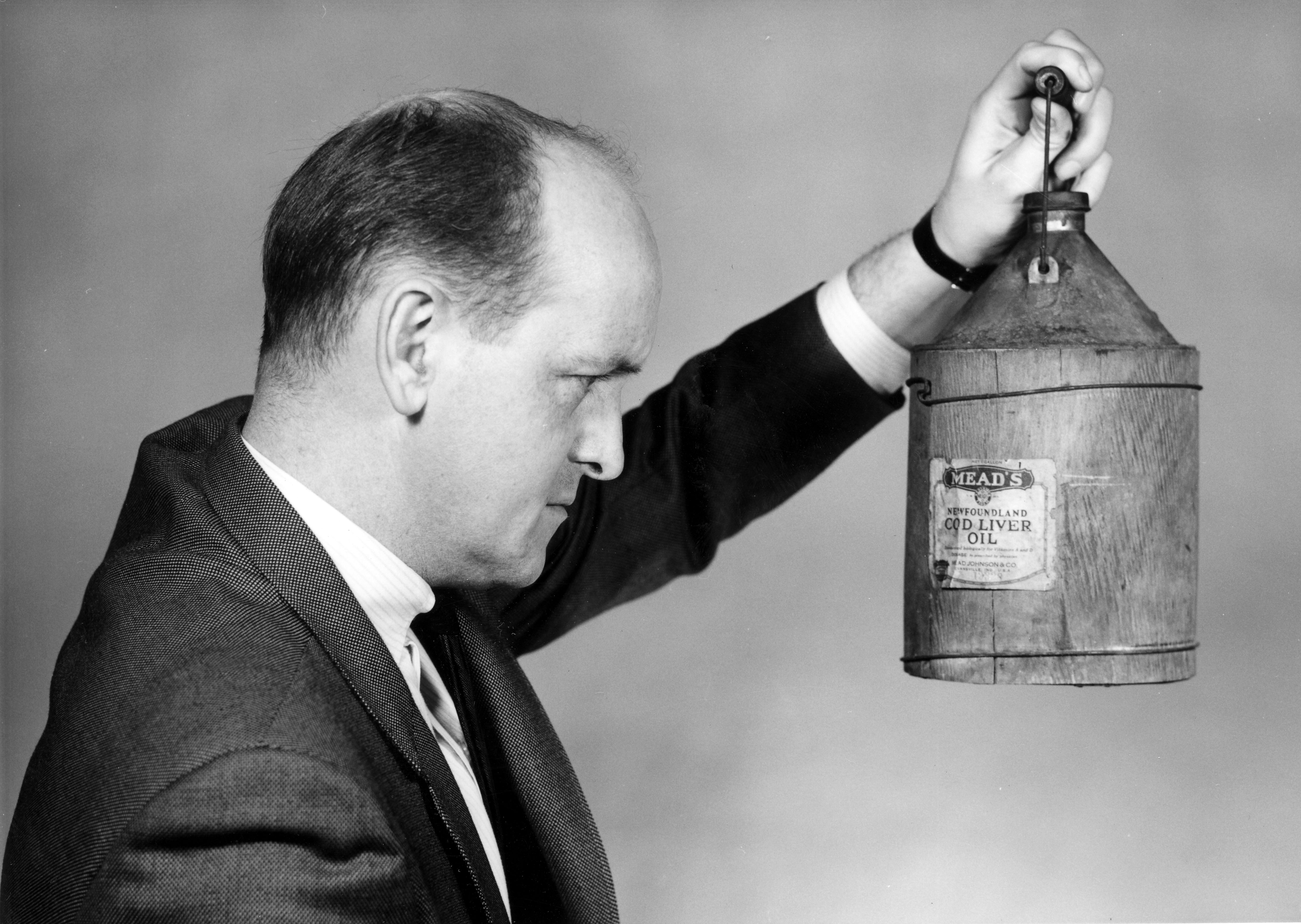 Unidentified man holding up an old can of Newfoundland Cod Liver Oil