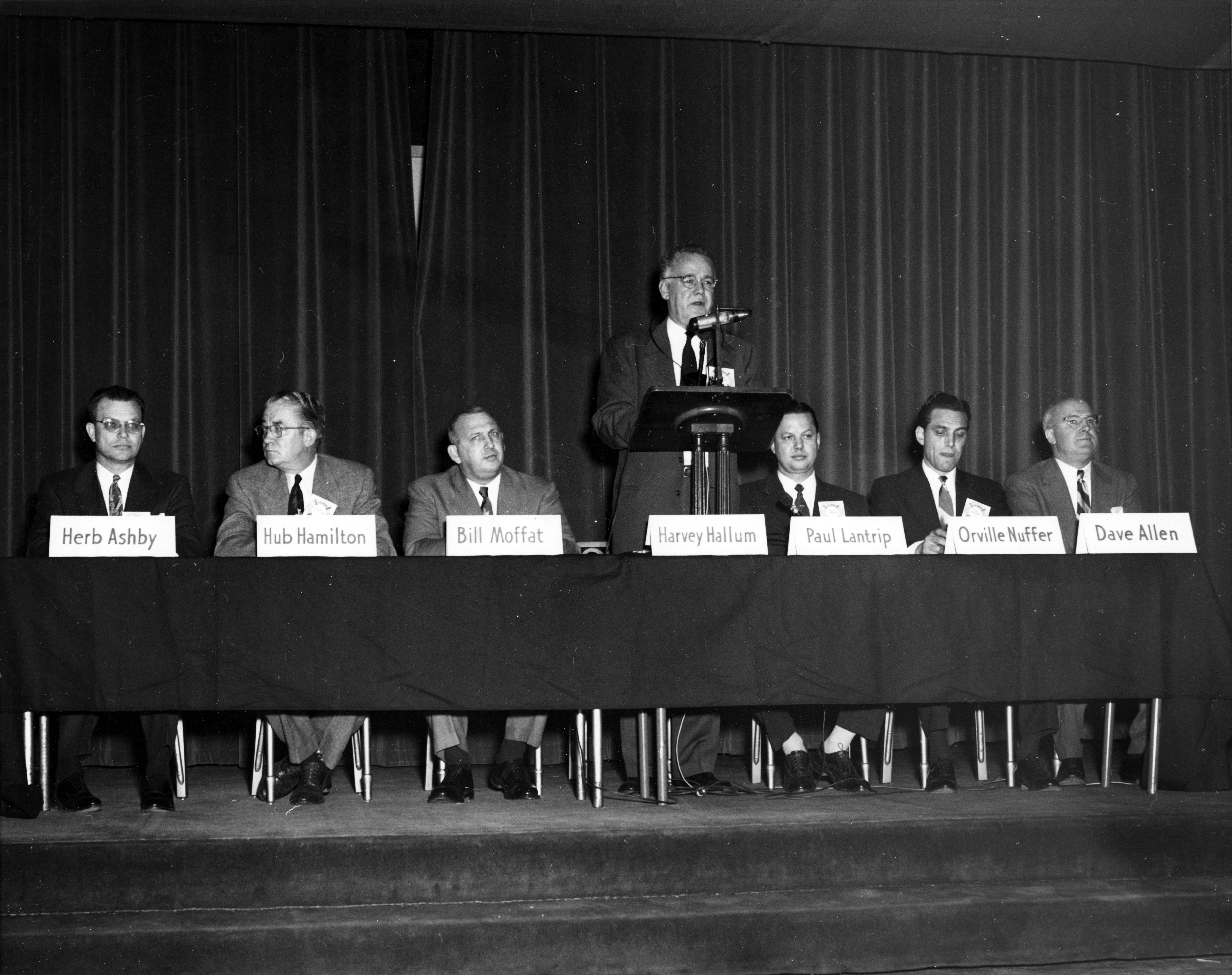 Herb Ashby, Hub Hamilton, Bill Moffat, Harvey Hallum, Paul Lantrip, Orville Nuffer, and Dave Allen sitting at the head table, with the speaker unidentified