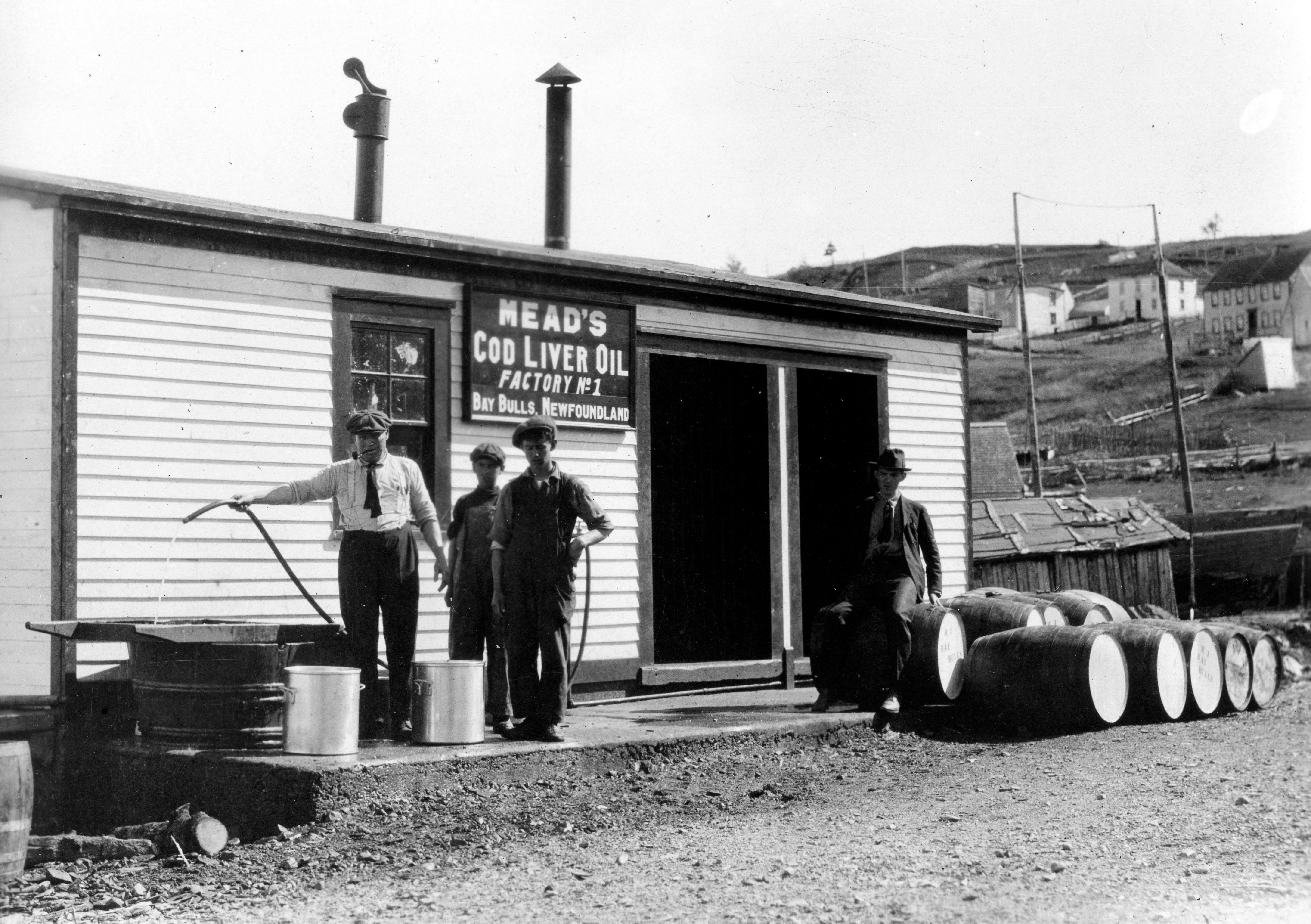 Mead Johnson factory no. 1, rendering factory at Bay Bulls, Newfoundland. Note the barrels of crude oil ready for shipment to Evansville