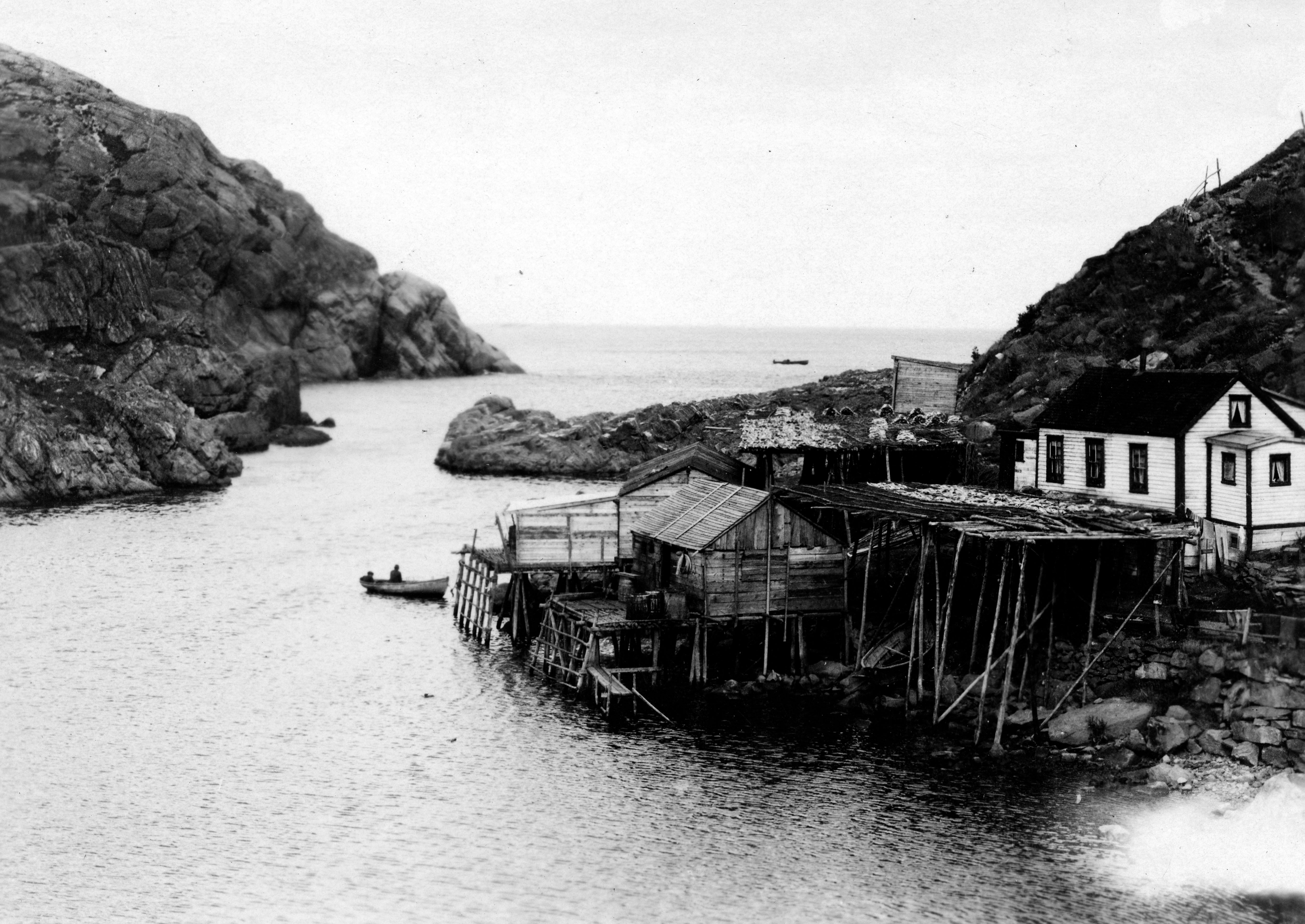 The stage is the house near the water. The flake is to the right. The codfish are first salted and then dried on the flake. There are some dried fish on this flake now.