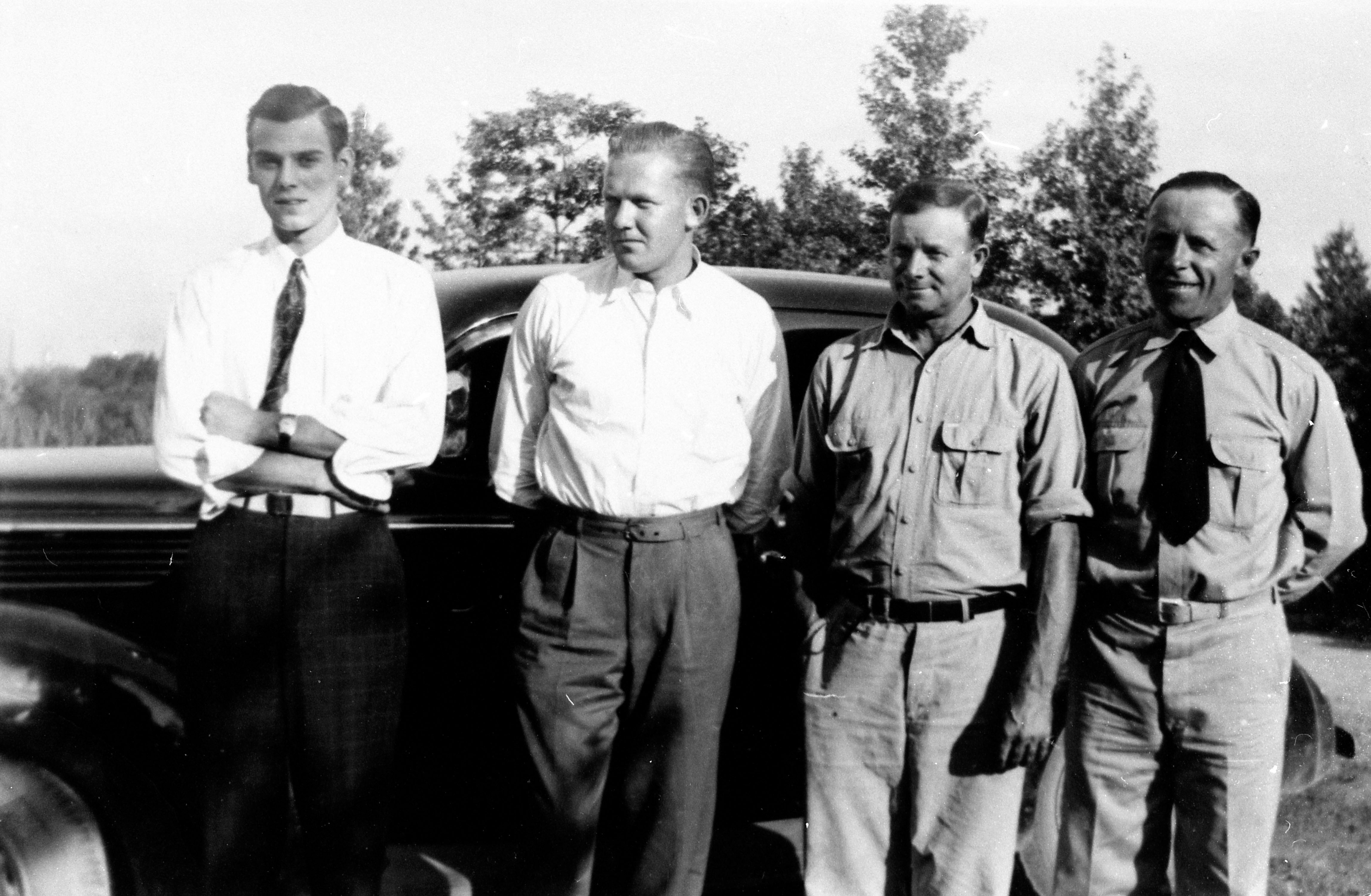 Albertus Lee Burlison (1919-1965), Andy Burlison, Isaac Nelson Burlison (1888–1945) , and Roy Harry Hape (1897–1969) . Bert is a brother to the donor of this collection, and Roy her husband. Nelson might be her father (that is who is identified above), bu
