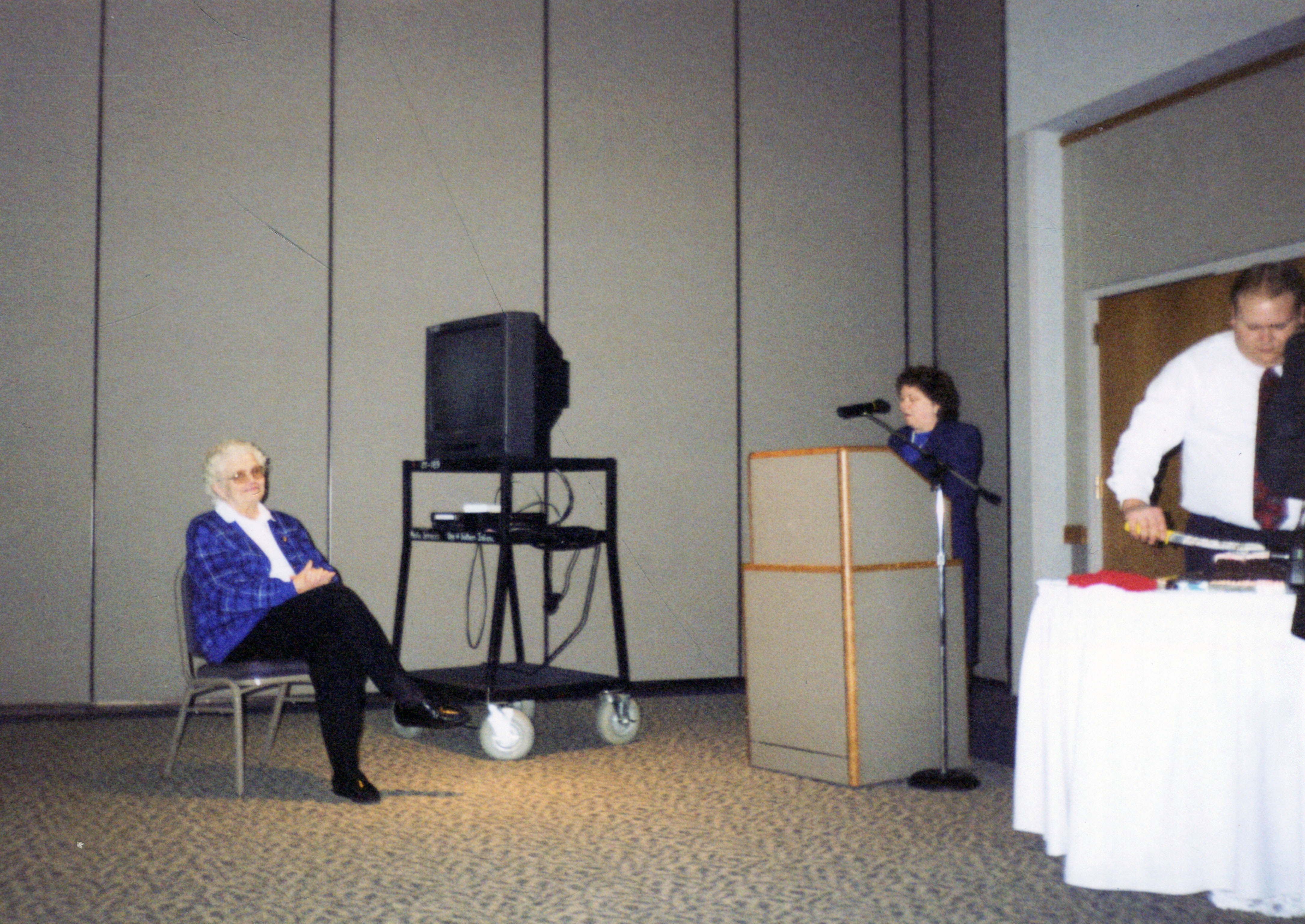 Ruth Kissel and Martha Niemeier (at microphone), probably at Ruth Kissel's retirement, library employees