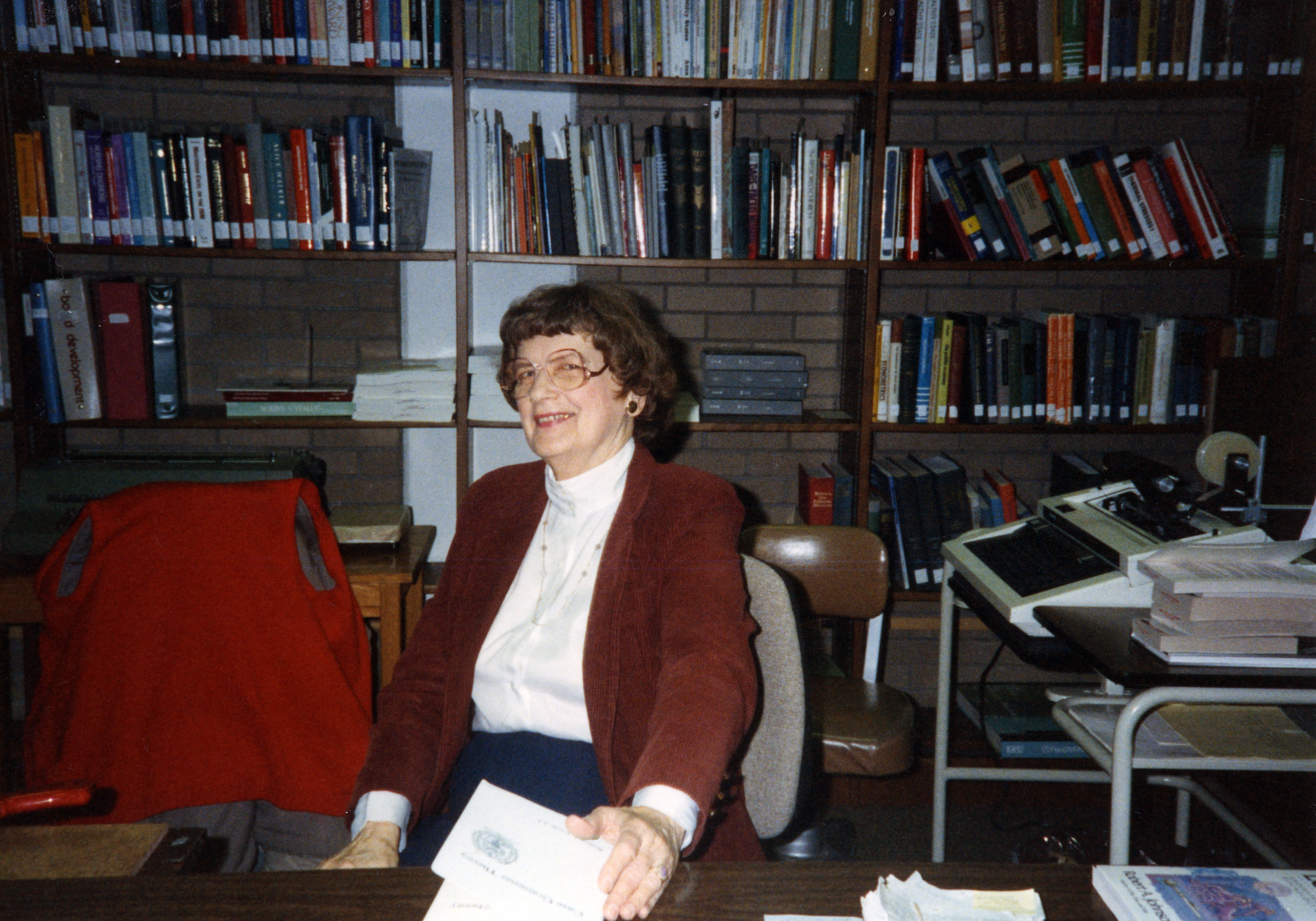 Pauline Schuler in the technical services area of the original David L. Rice Library