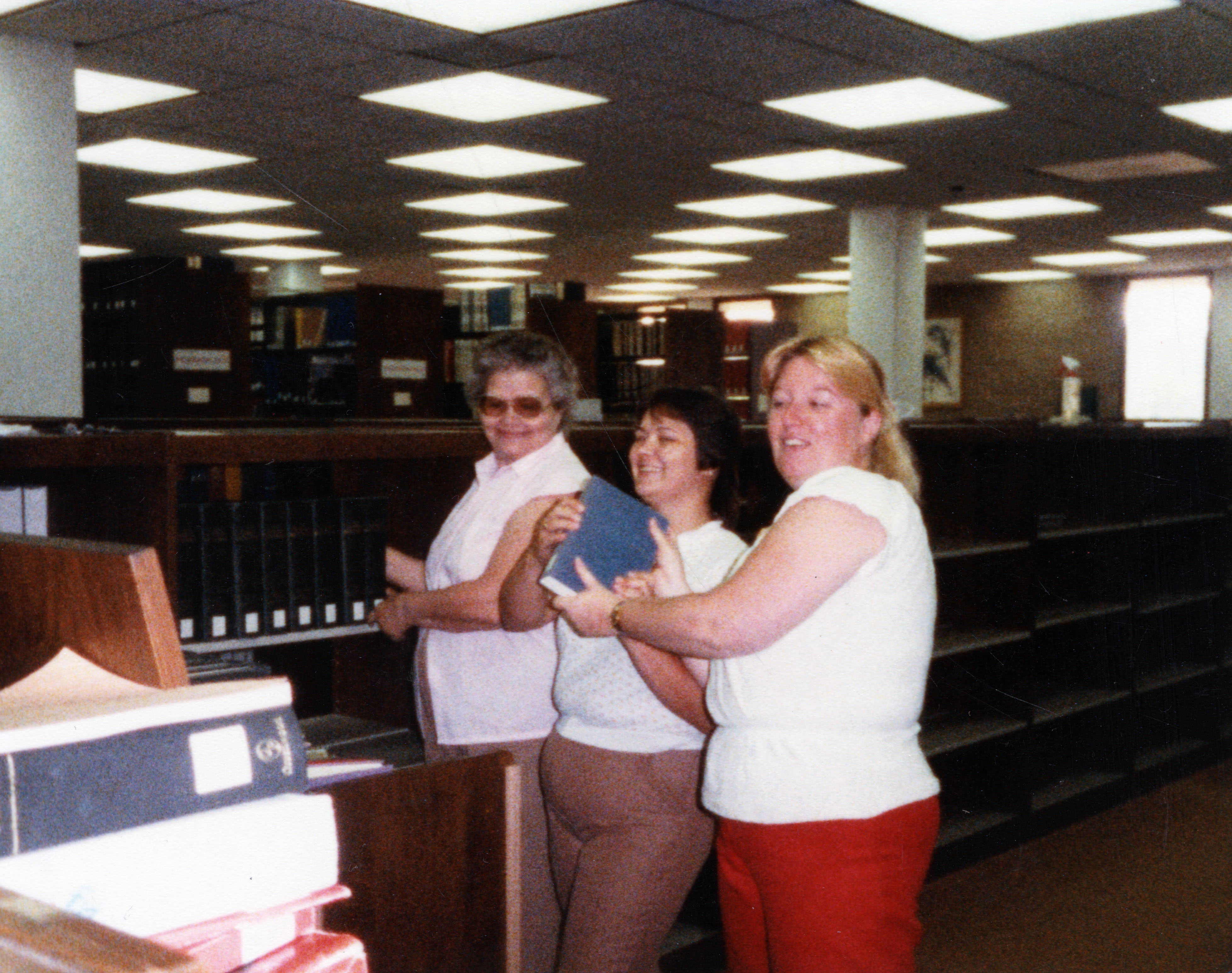 Ruth Kissel, Ruth Clevenger, and Gina Walker in the original David L. Rice Library