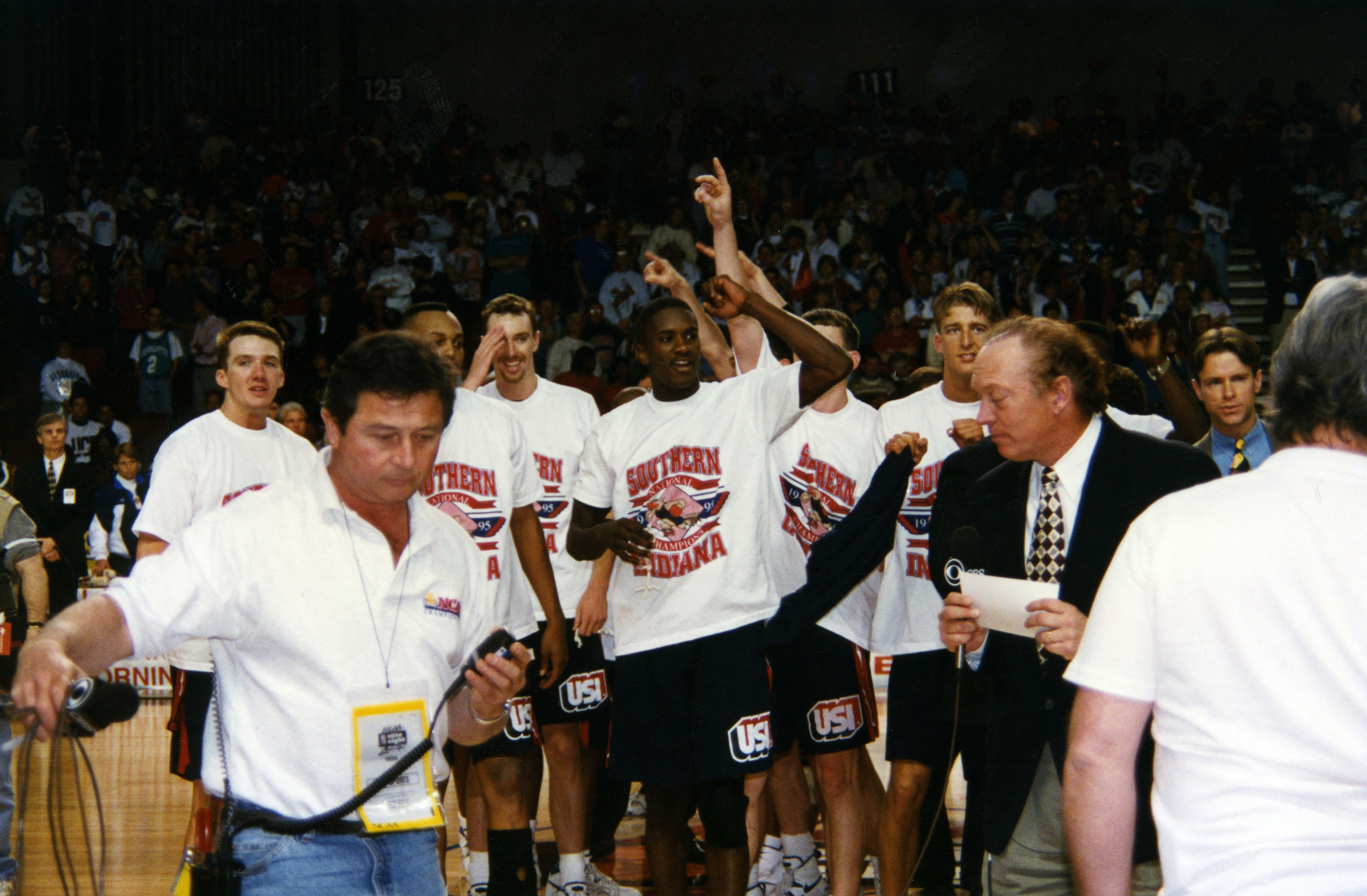 Men's basketball players Brad Huebner, Cortez Barnes, Neil Coyle, Stan Gouard, Chad Gilbert, and Dick Stockton of CBS Sports News. 1995 NCAA Men's Division II Basketball tournament champions. Louisville, Kentucky