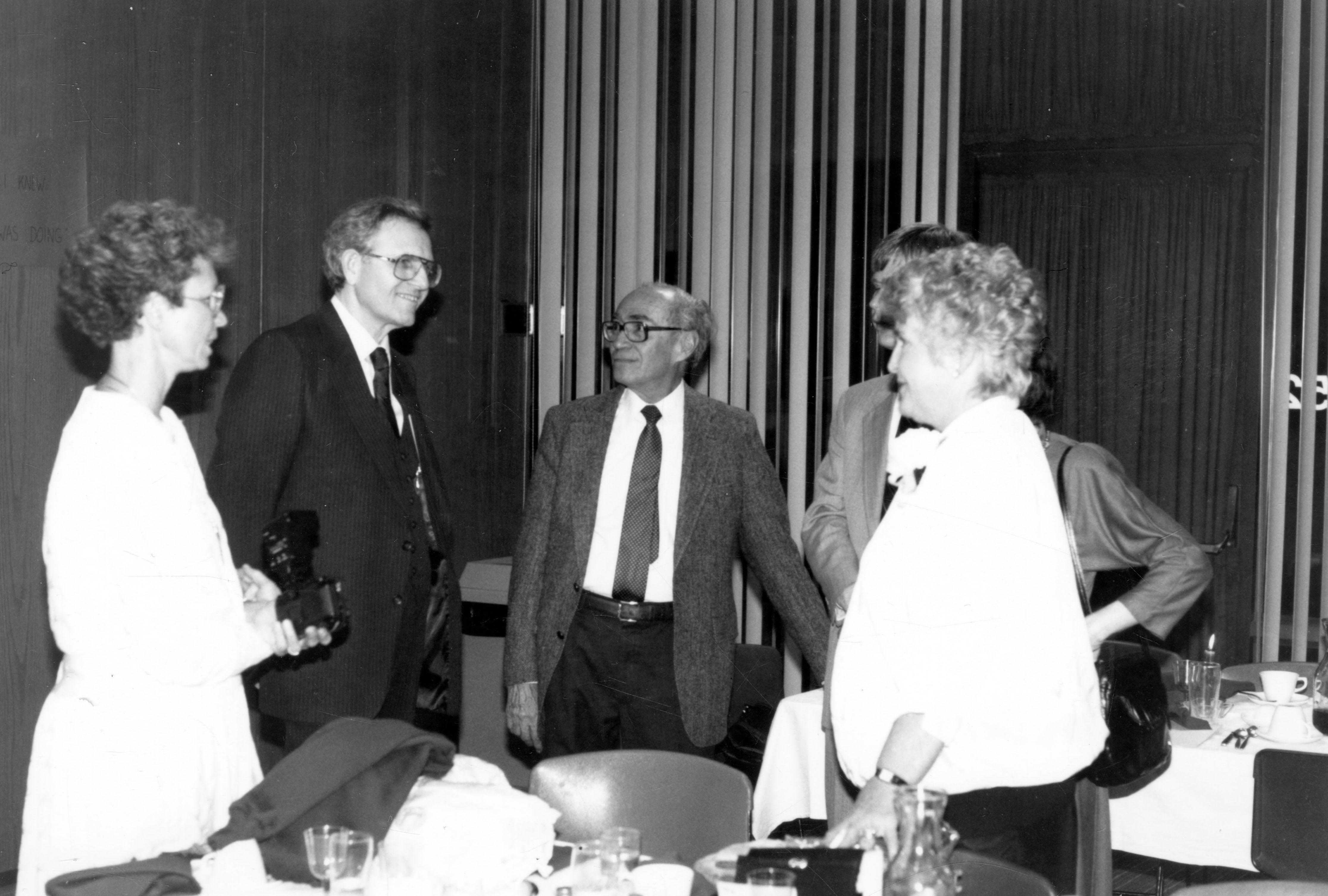 Mariann Pitzer, Donald Pitzer (professor of history), J. Eliseo DaRosa (professor of business), and Jean Miller at Daniel Miller's retirement reception