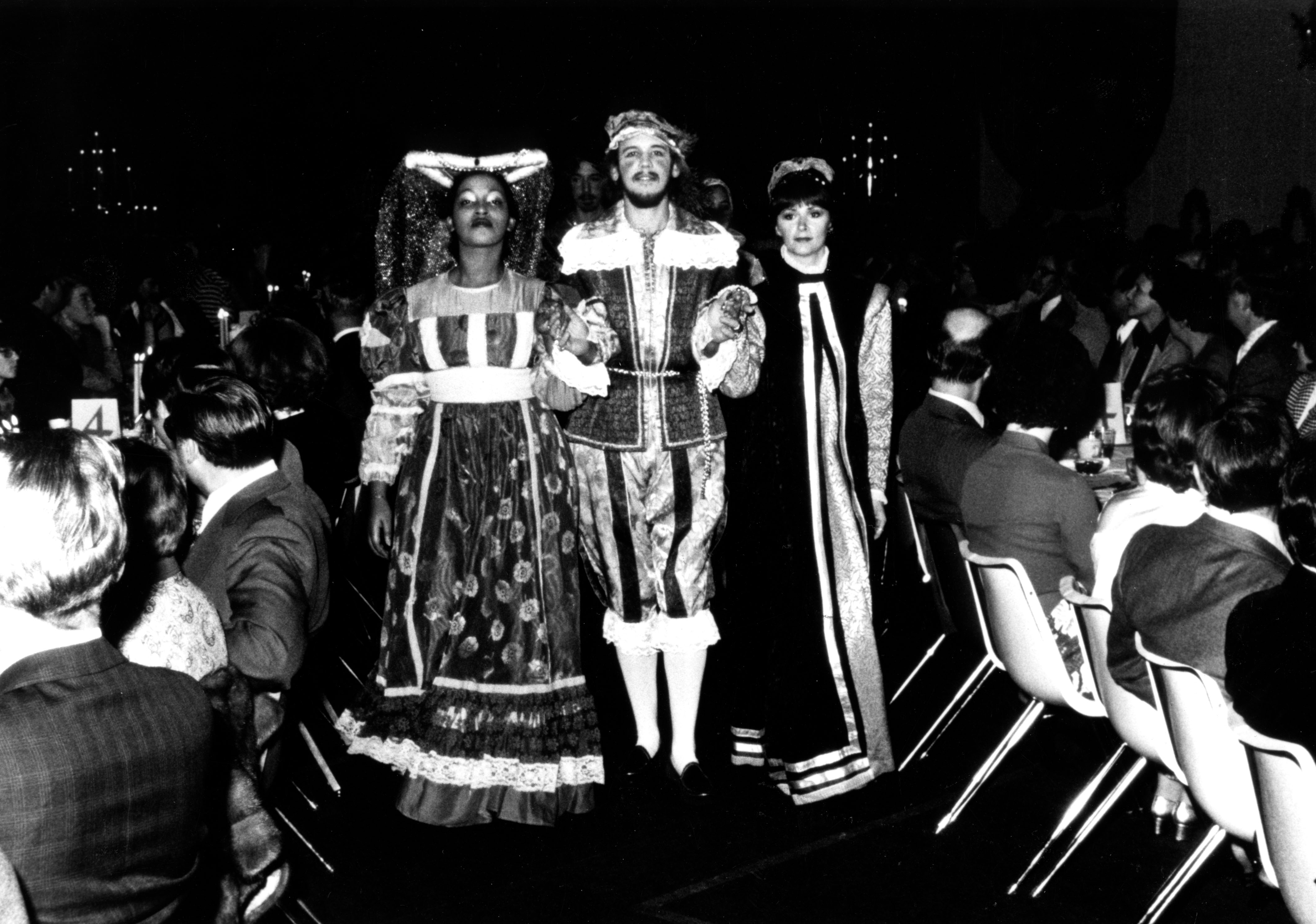 Linda Alexander, Time Sinclair, and Rebecca Lane exiting the stage after hanging the greens.