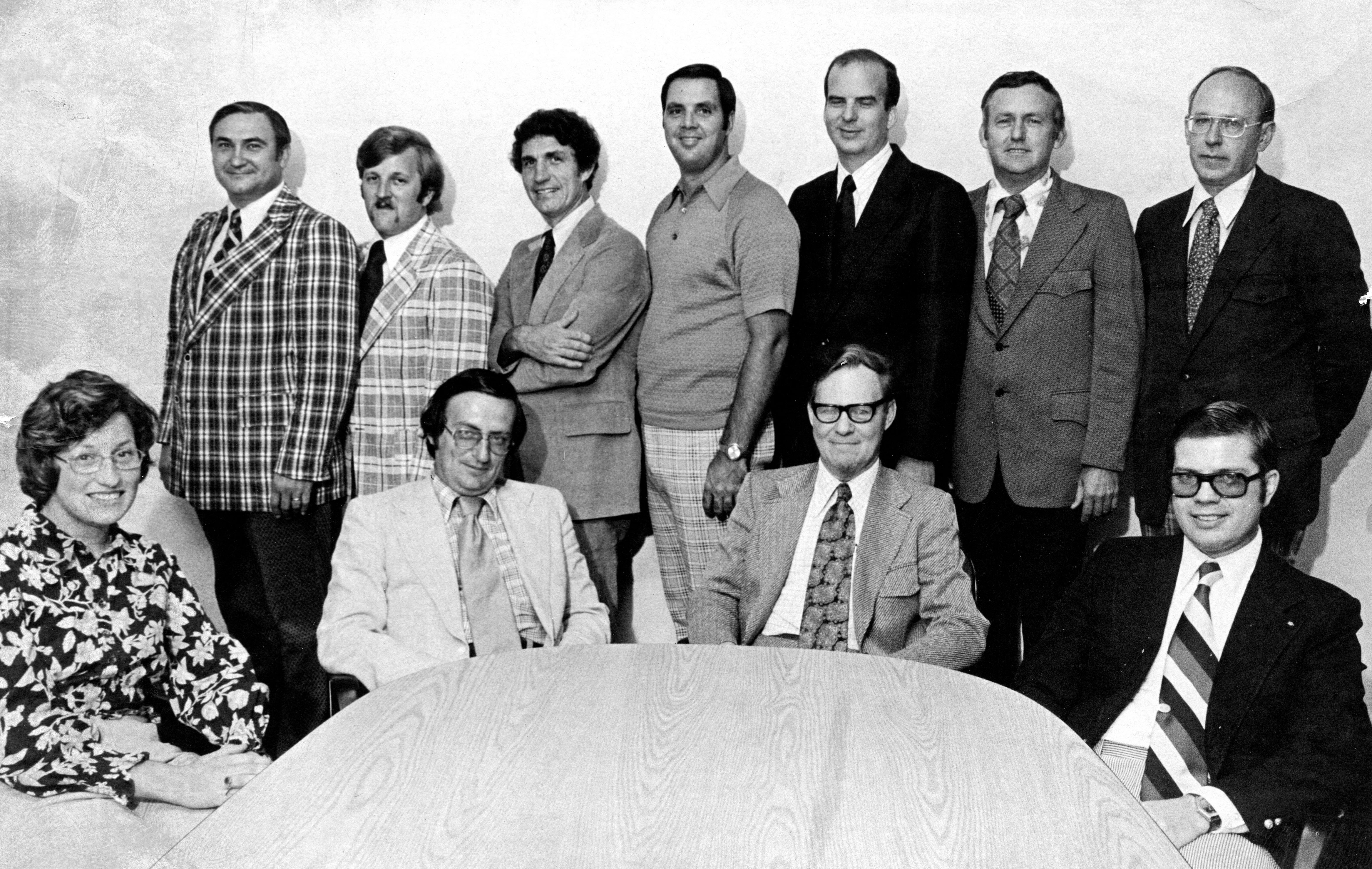 Athletic board photo, Row 1 (L-R): Billie Jo Koester, Anthony Tilmans, Dr. Dan Miller, Dr. Larry Arp, Row 2 (L-R): Dr. Charles Bertram, Paul Hinkle, William B. Leedy, Wayne Boultinghouse, Dr. Howard Dunn, Don Bennett, and Bryon Wright