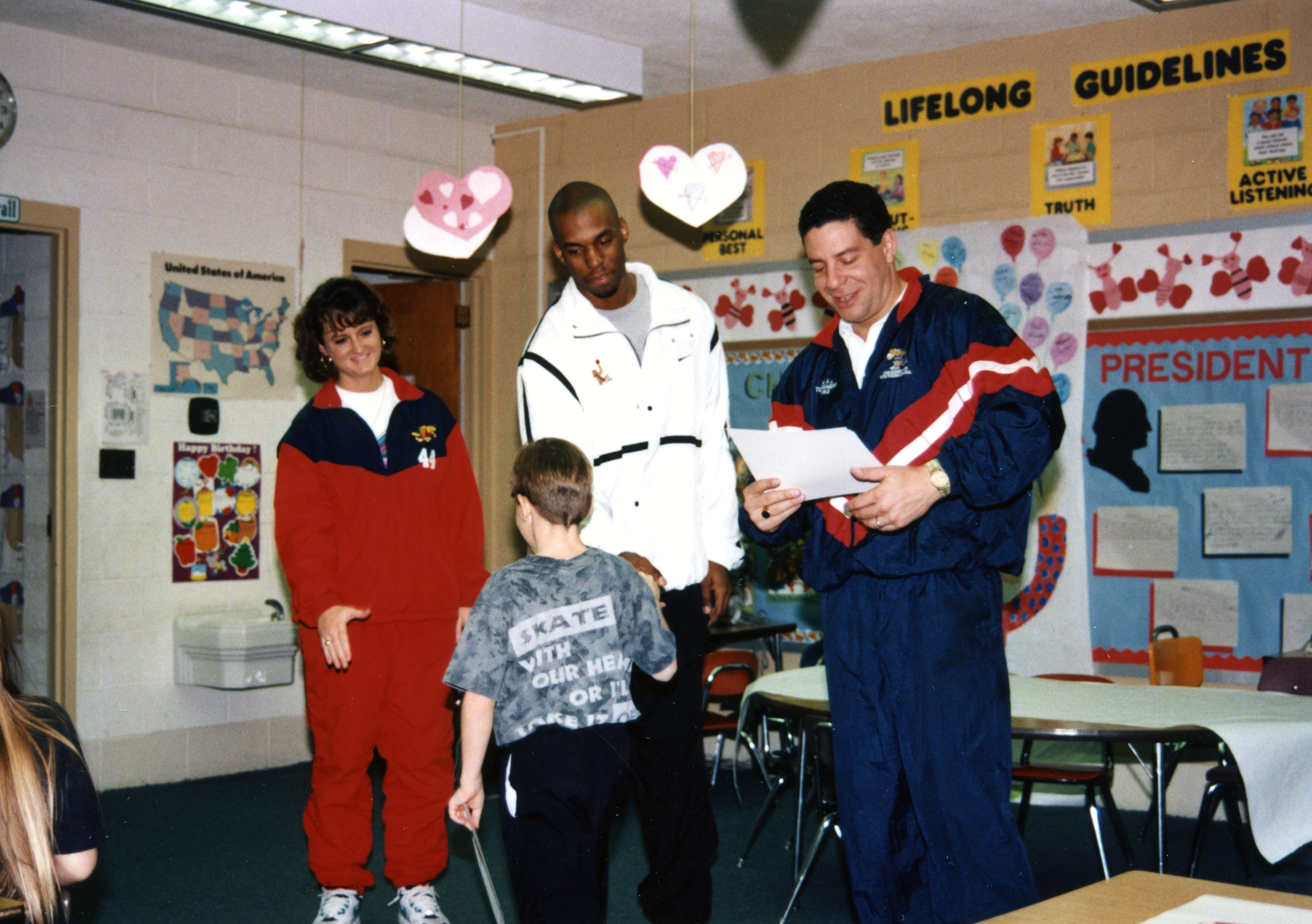Men's basketball coach Bruce Pearl, women's basketball coach Chancellor Dugan, and men's basketball player Scott Boyden at elementary school for Eagle Math Mania