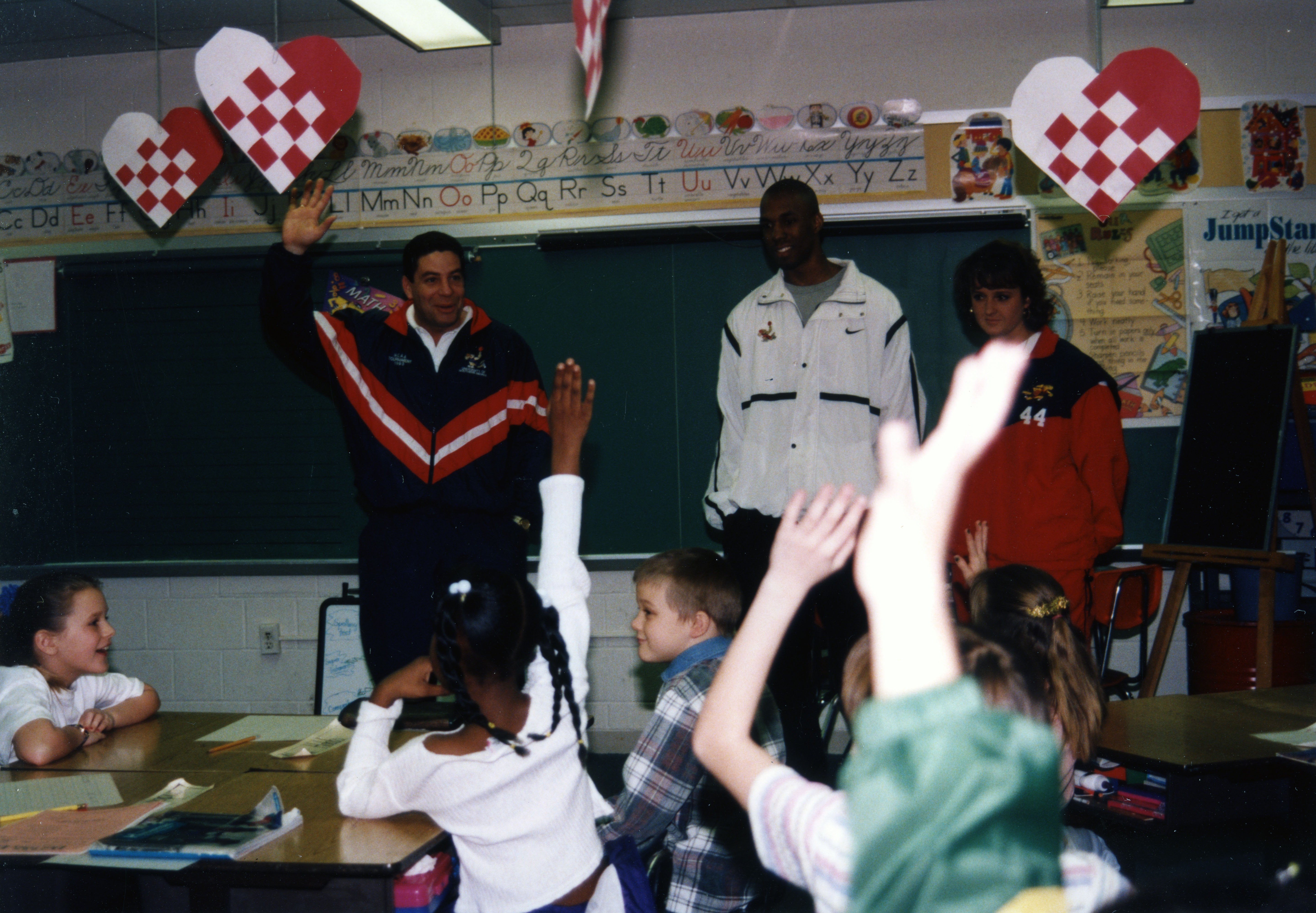 Men's basketball coach Bruce Pearl, women's basketball coach Chancellor Dugan, and men's basketball player Scott Boyden at elementary school for Eagle Math Mania