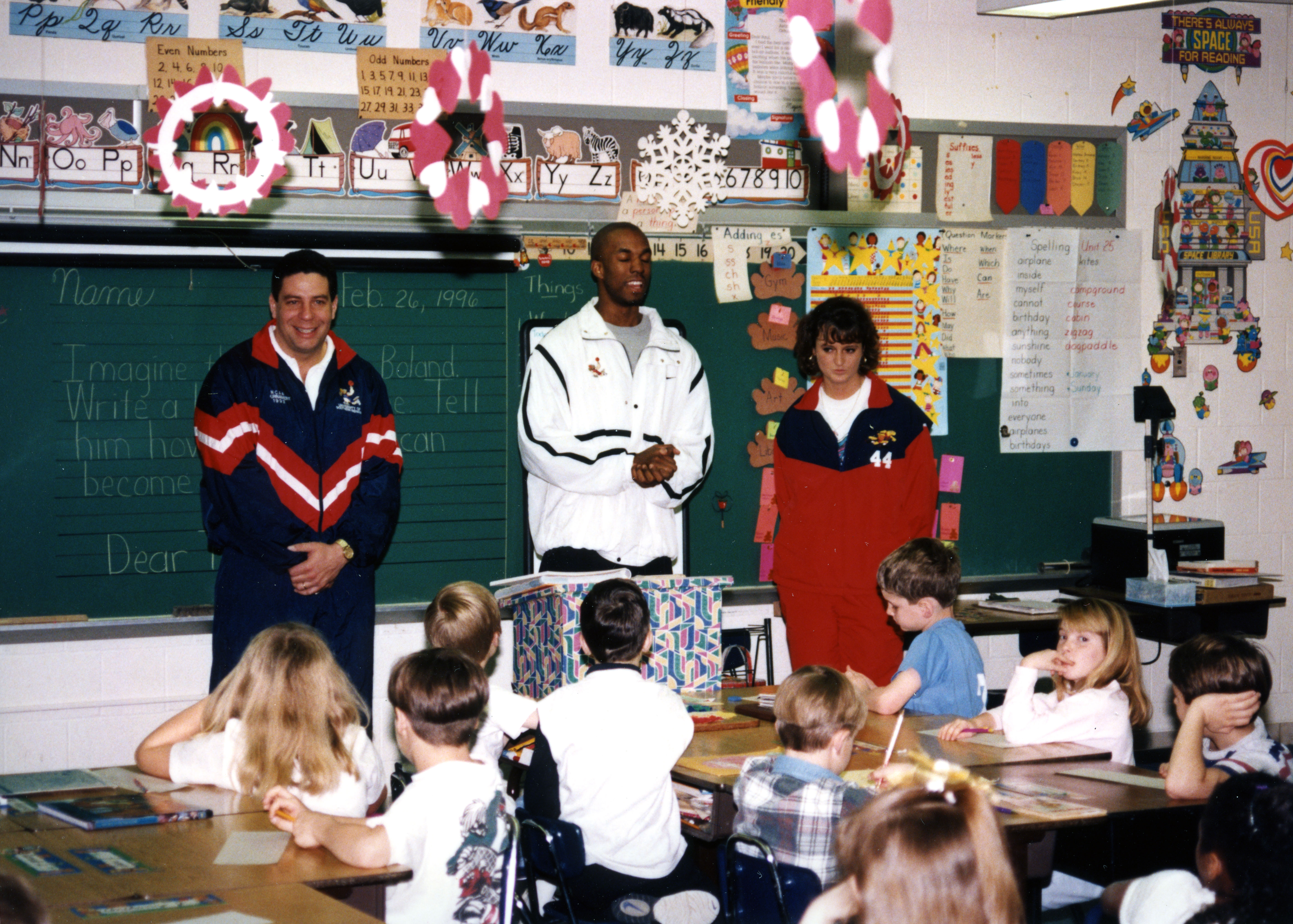 Men's basketball coach Bruce Pearl, women's basketball coach Chancellor Dugan, and men's basketball player Scott Boyden at elementary school for Eagle Math Mania