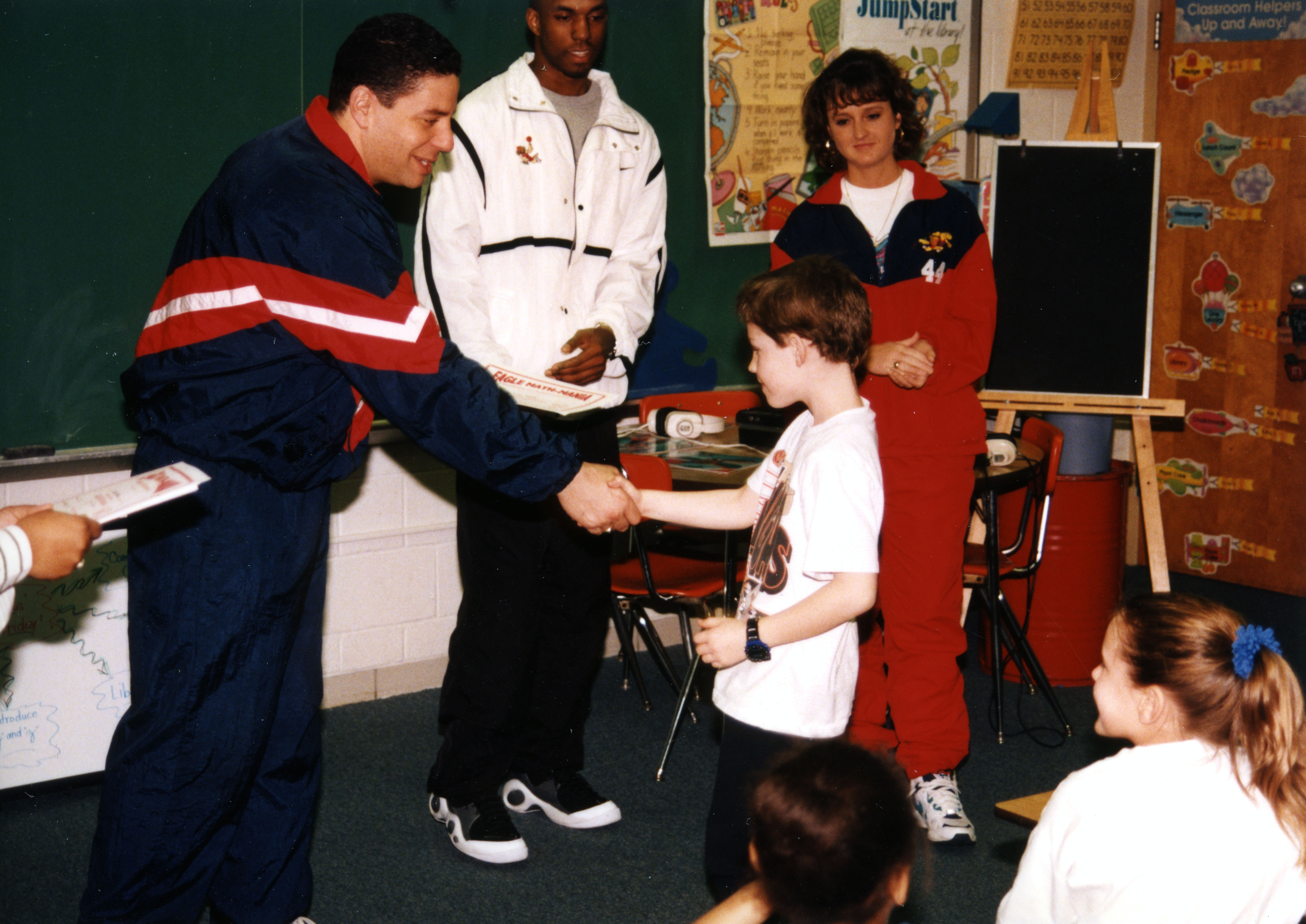Men's basketball coach Bruce Pearl, women's basketball coach Chancellor Dugan, and men's basketball player Scott Boyden at elementary school for Eagle Math Mania