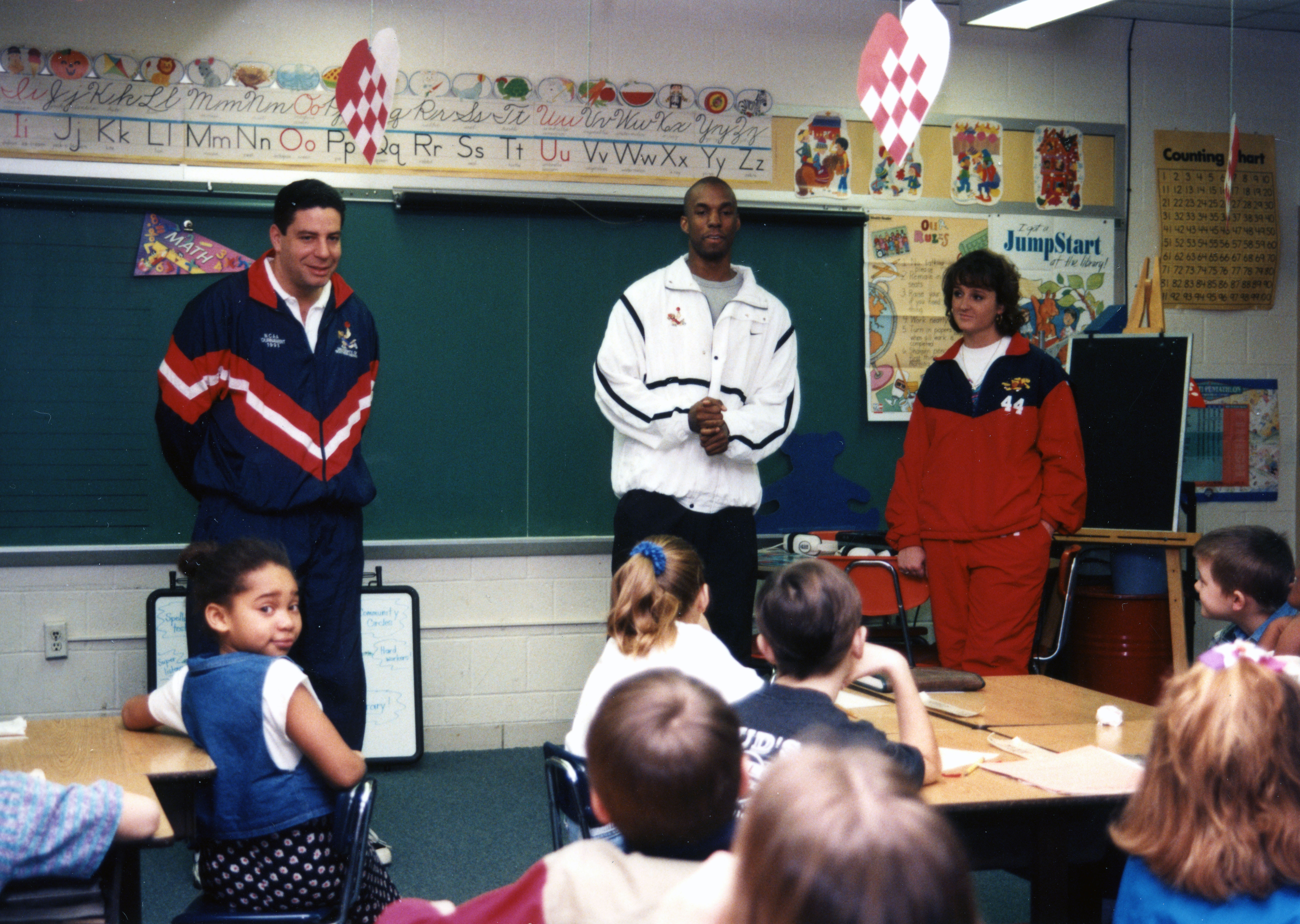 Men's basketball coach Bruce Pearl, women's basketball coach Chancellor Dugan, and men's basketball player Scott Boyden at elementary school for Eagle Math Mania