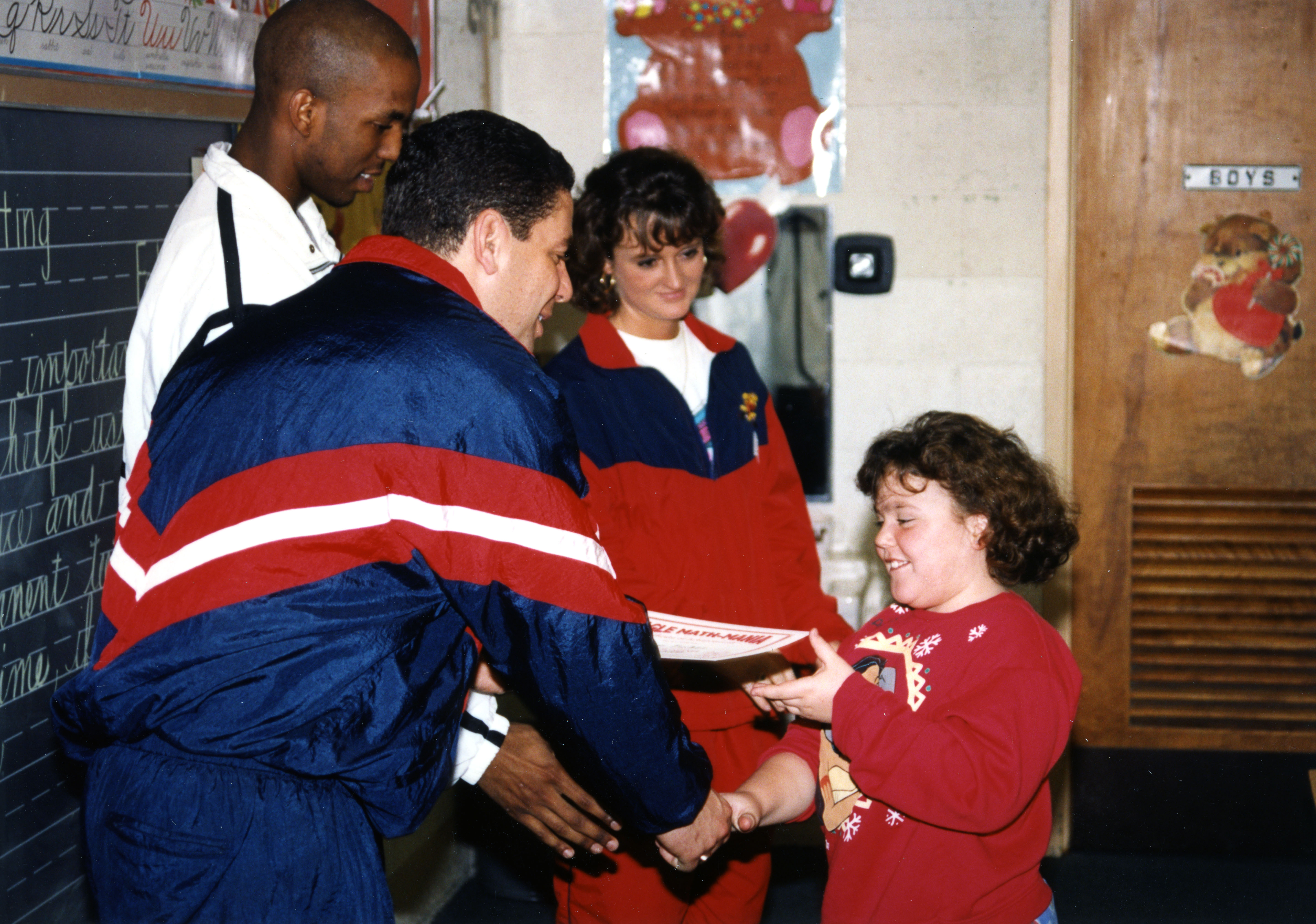 Men's basketball coach Bruce Pearl, women's basketball coach Chancellor Dugan, and men's basketball player Scott Boyden at elementary school for Eagle Math Mania