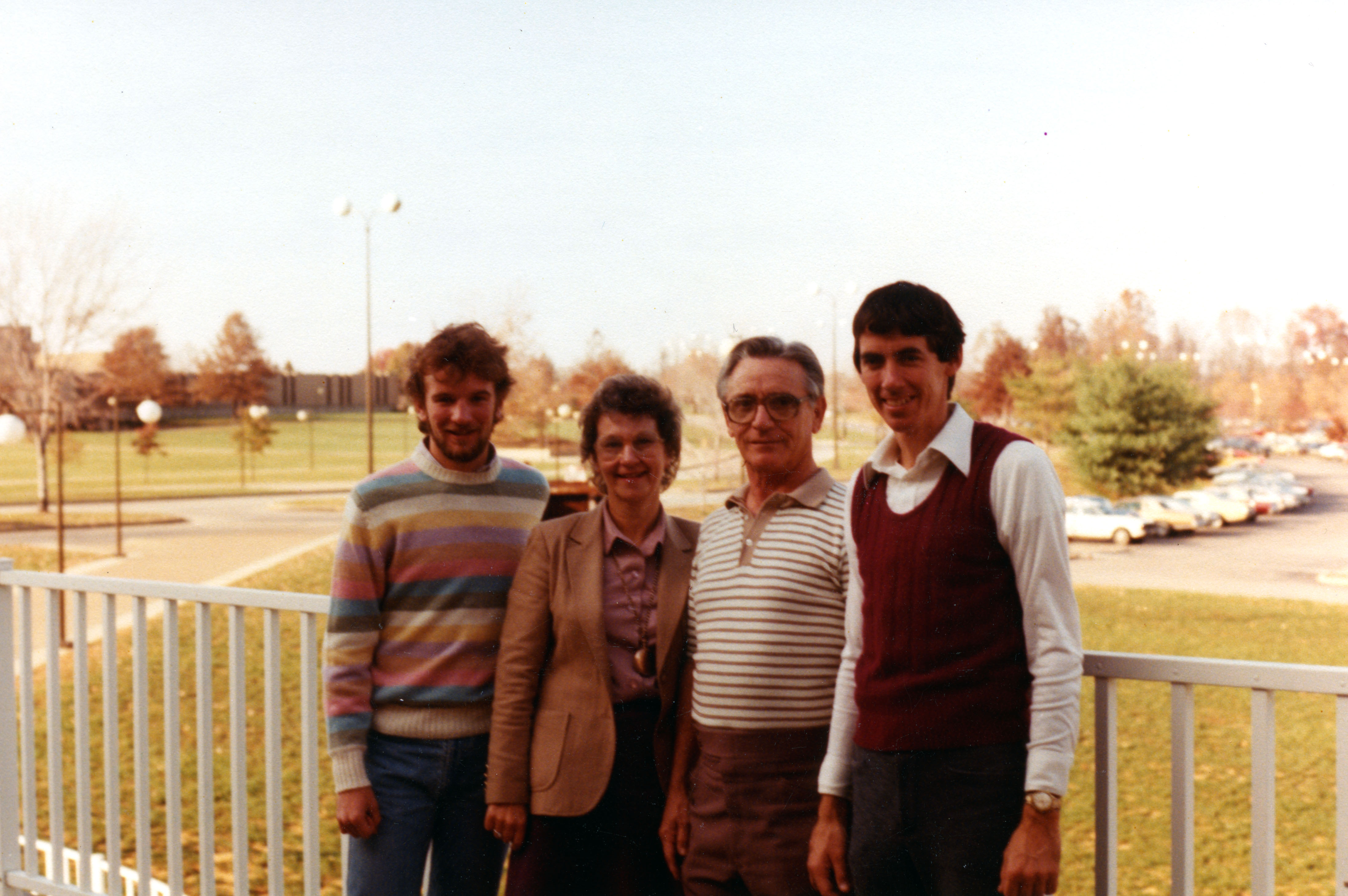 ISUE athletic personnel: (L-R): Student sports information coordinator Tom Schuler, athletic secretary Rita Murphy, equipment manager Ray Walker, and David Vaughn
