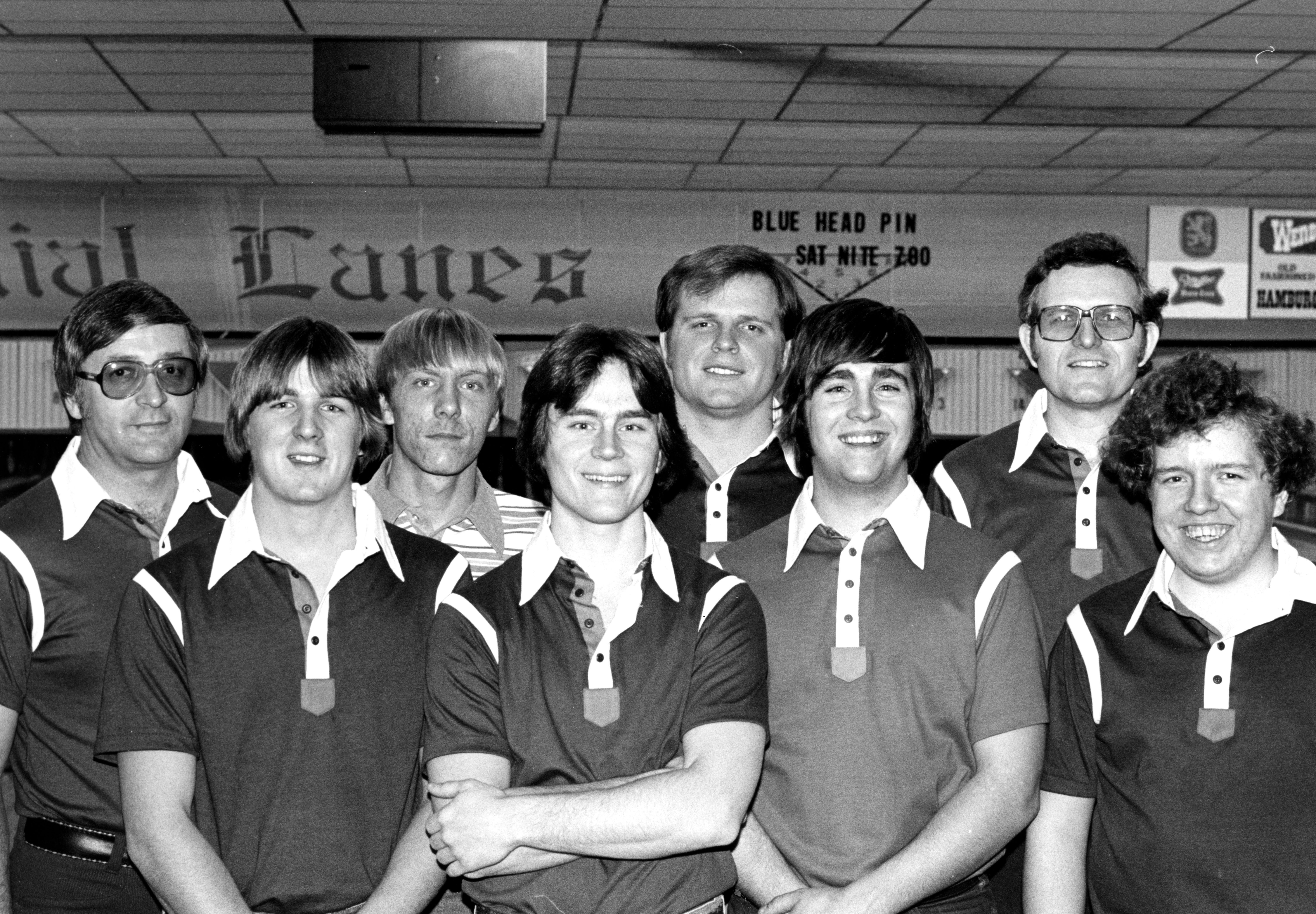 Intramural sports men's bowling team, Jeff Jones, Bill Hufnagel, Jeff , Dave Baumeyer, Tim Fickas, faculty advisor Dr. Donald Pitzer, and Jeff Crowley