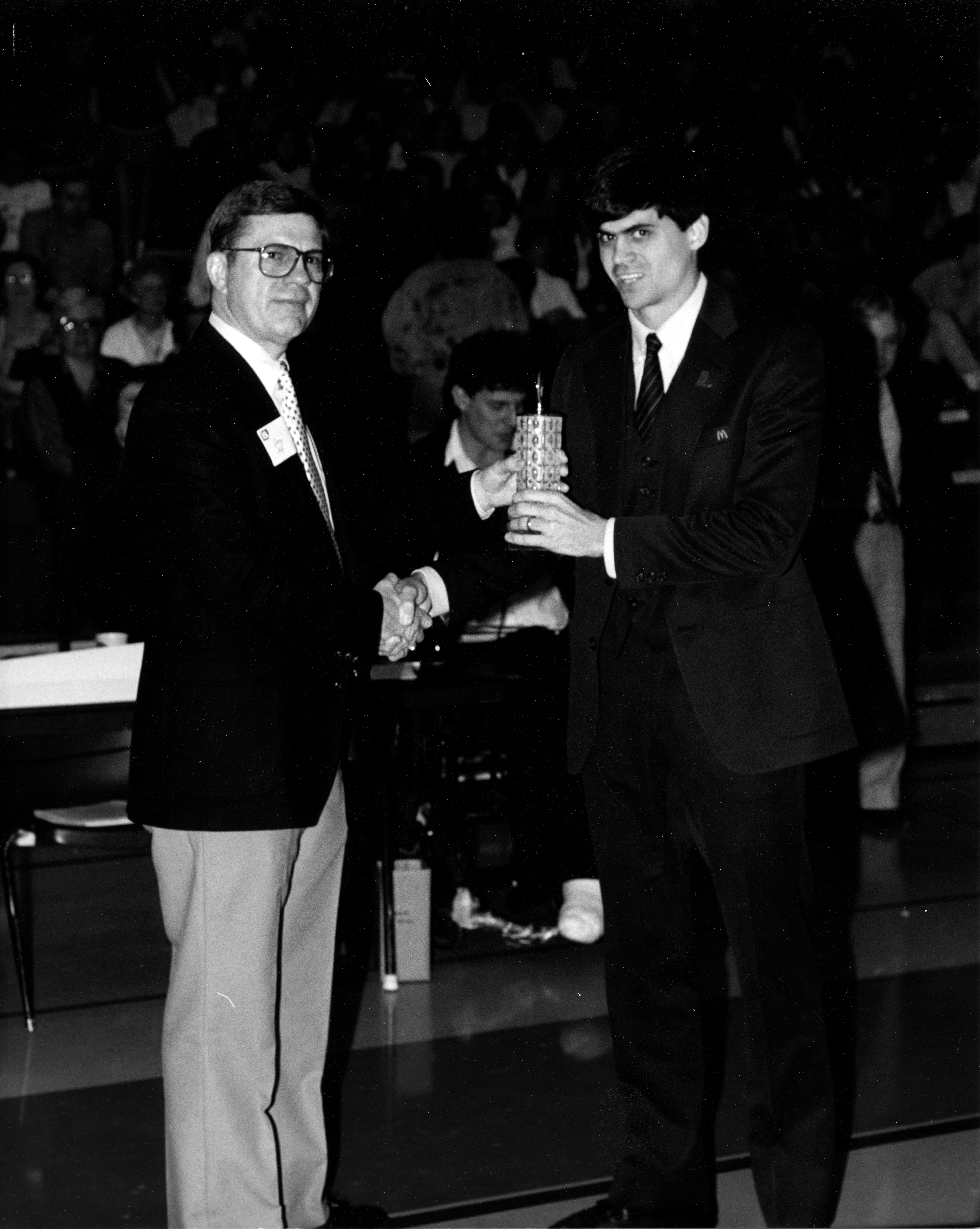 Director of Athletics Larry Arp presenting award during a men's basketball game