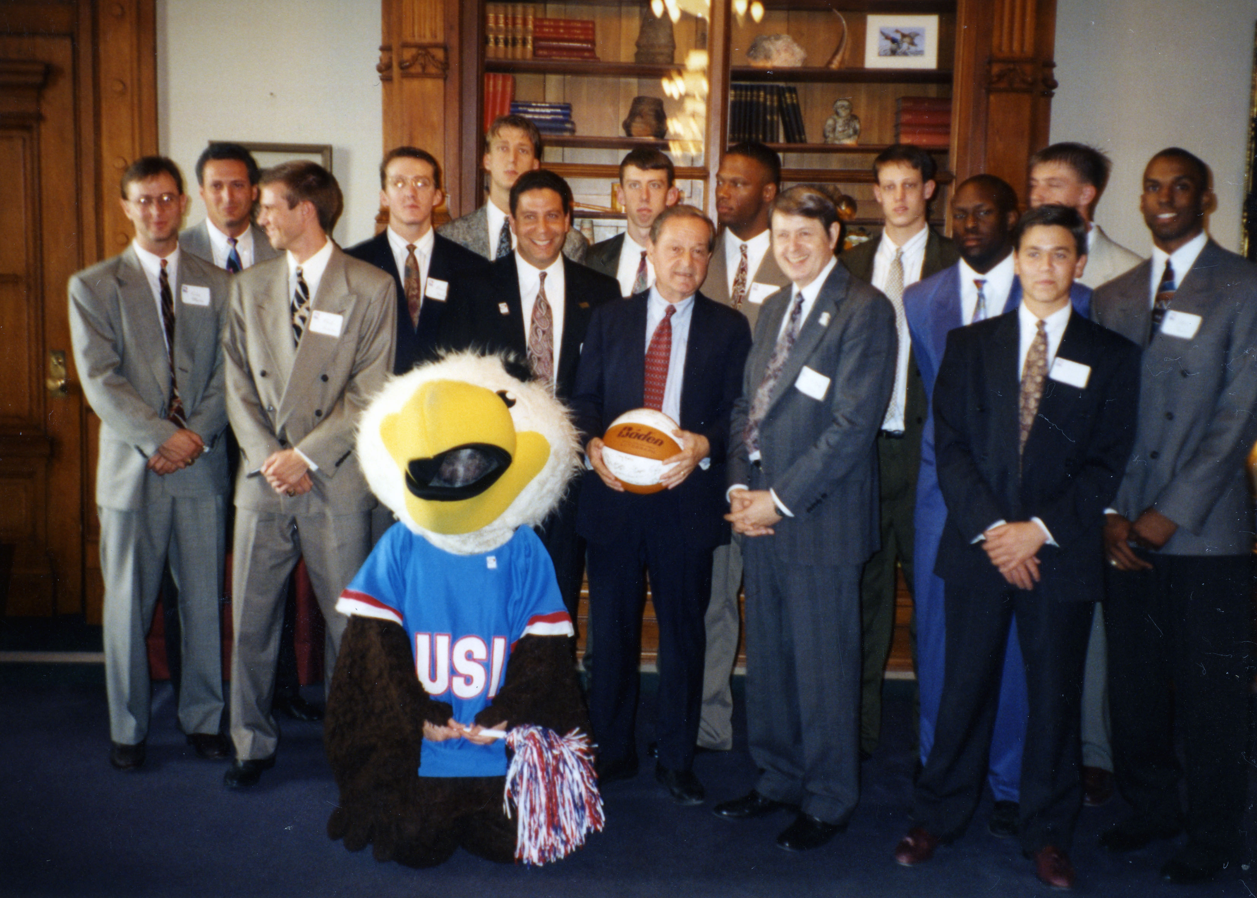Men's basketball team, Row 1 (L-R): Archibald T. Eagle, Row 2 (L-R): Head manager Harry Briggs, Marc Hostetter, coach Bruce Pearl, Indiana Lieutenant Governor Frank O'Bannon, USI president Dr. H. Ray Hoops, manager Brad Schmitt, Row 3 (L-R): Assistant coa