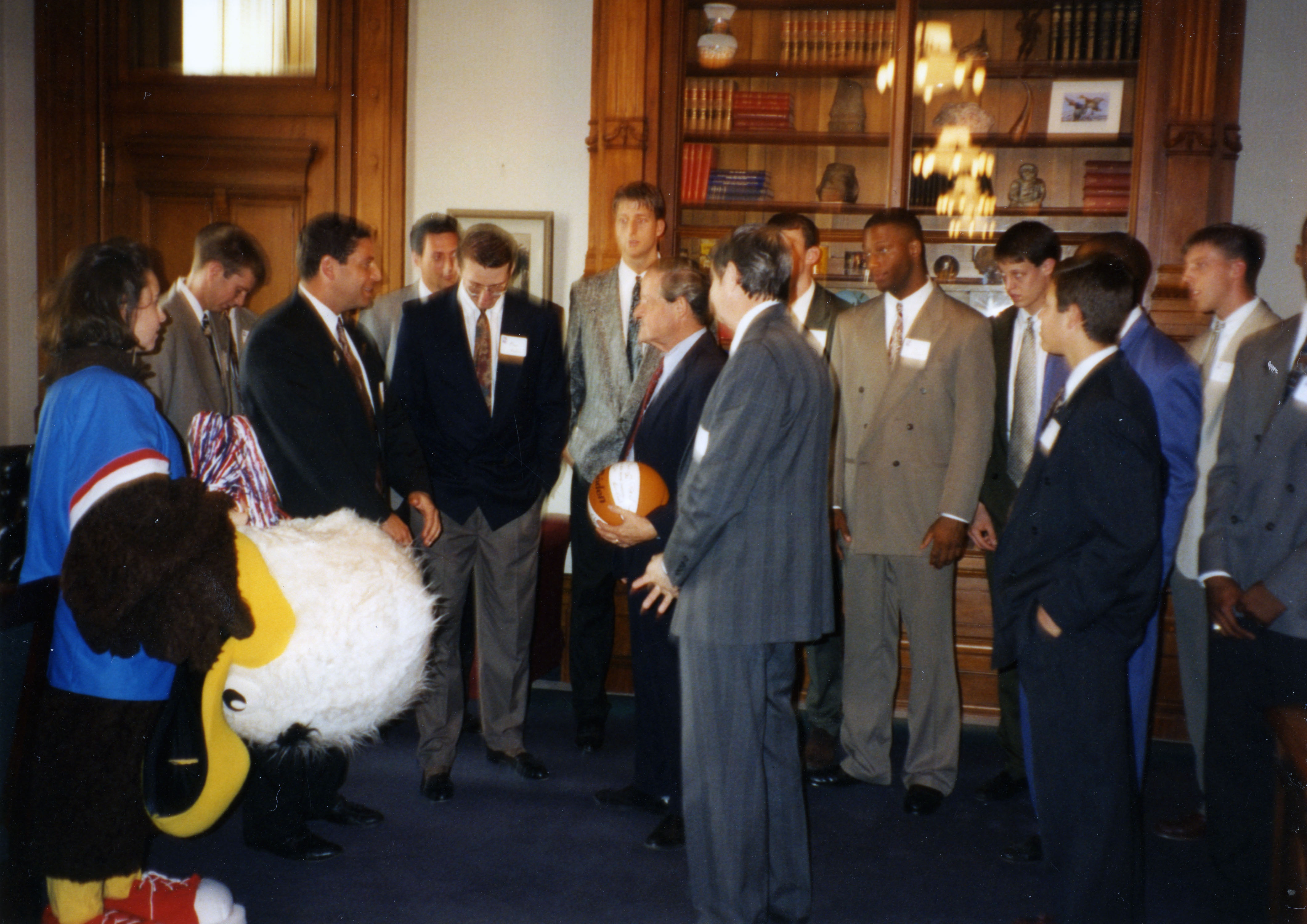 Men's basketball players Marc Hostetter, Chad Gilbert, coach Bruce Pearl, Rick Herdes, USI president Dr. H. Ray Hoops, Tim Tooley, Grant Childers, Scott Boyden, Indiana Lieutenant Governor Frank O'Bannon, and school mascot Archibald T. Eagle. Indianapolis