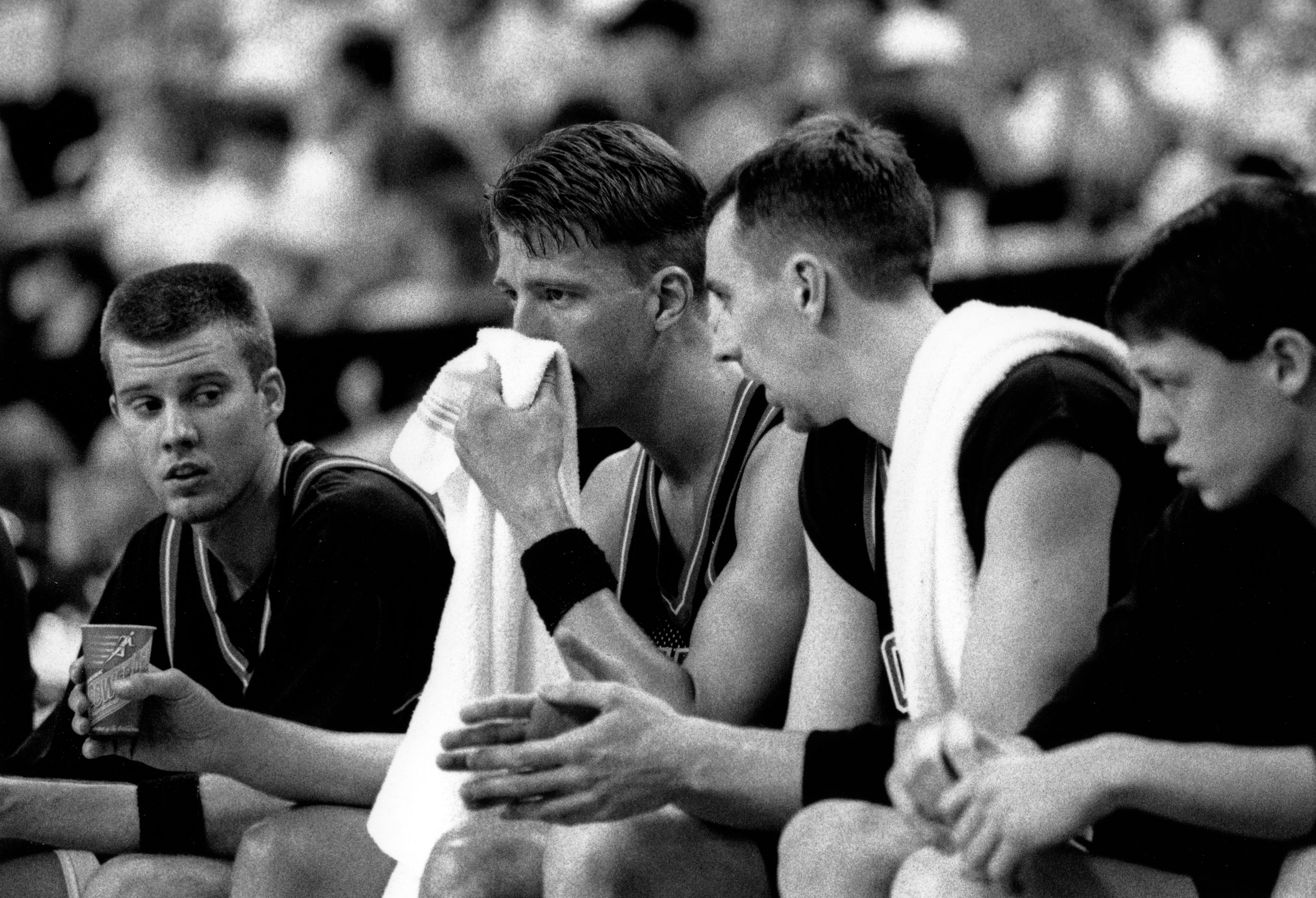 Men's basketball players Marc Hostetter, Chad Gilbert, Neil Coyle, and Tim Tooley
