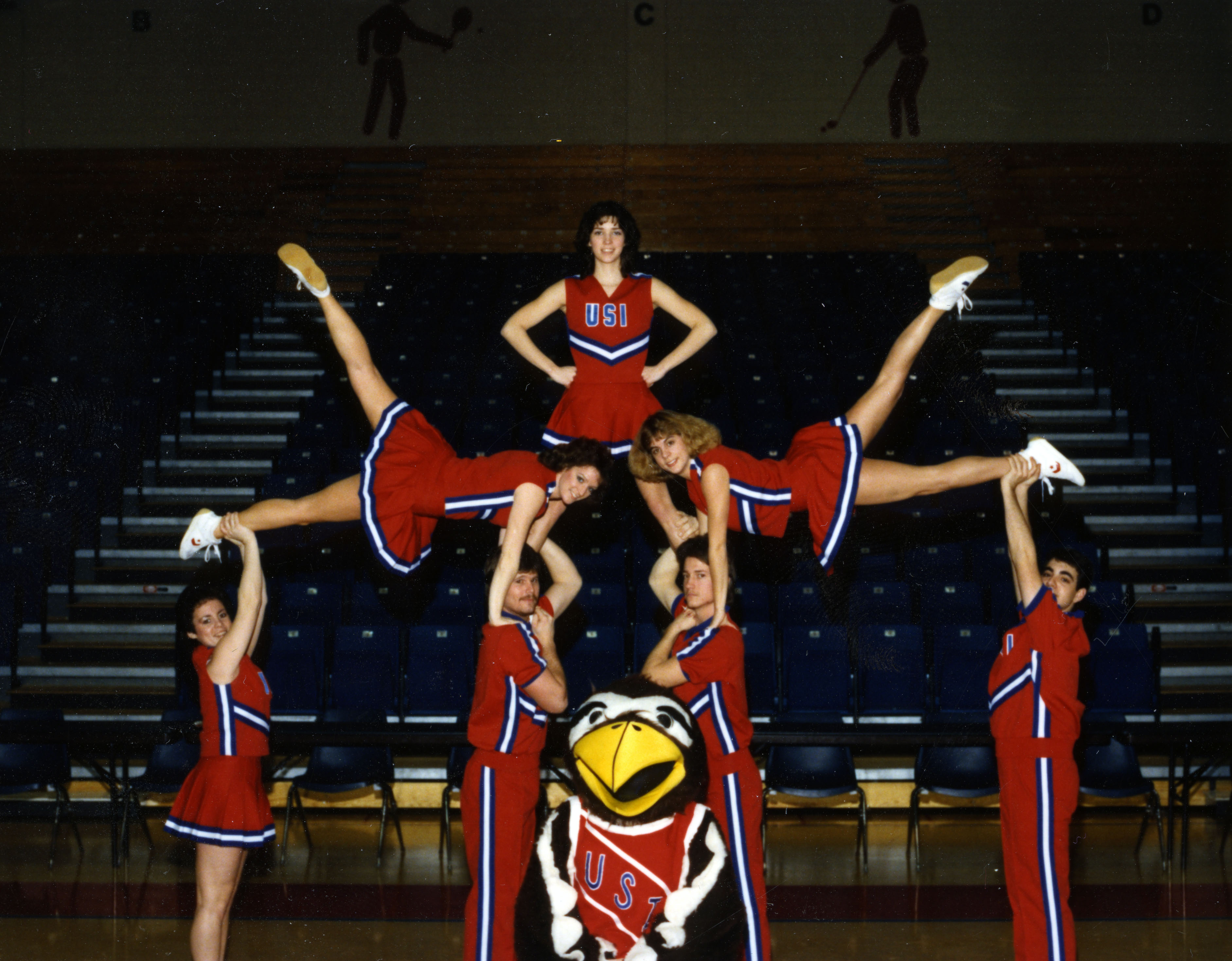 Cheerleaders Ruth Tieken, Tim O'Dell, Alan Martin, Fred Sanello, Becky Carnes, Brenda McCain, Tammy Miller, and school mascot Archibald T. Eagle.