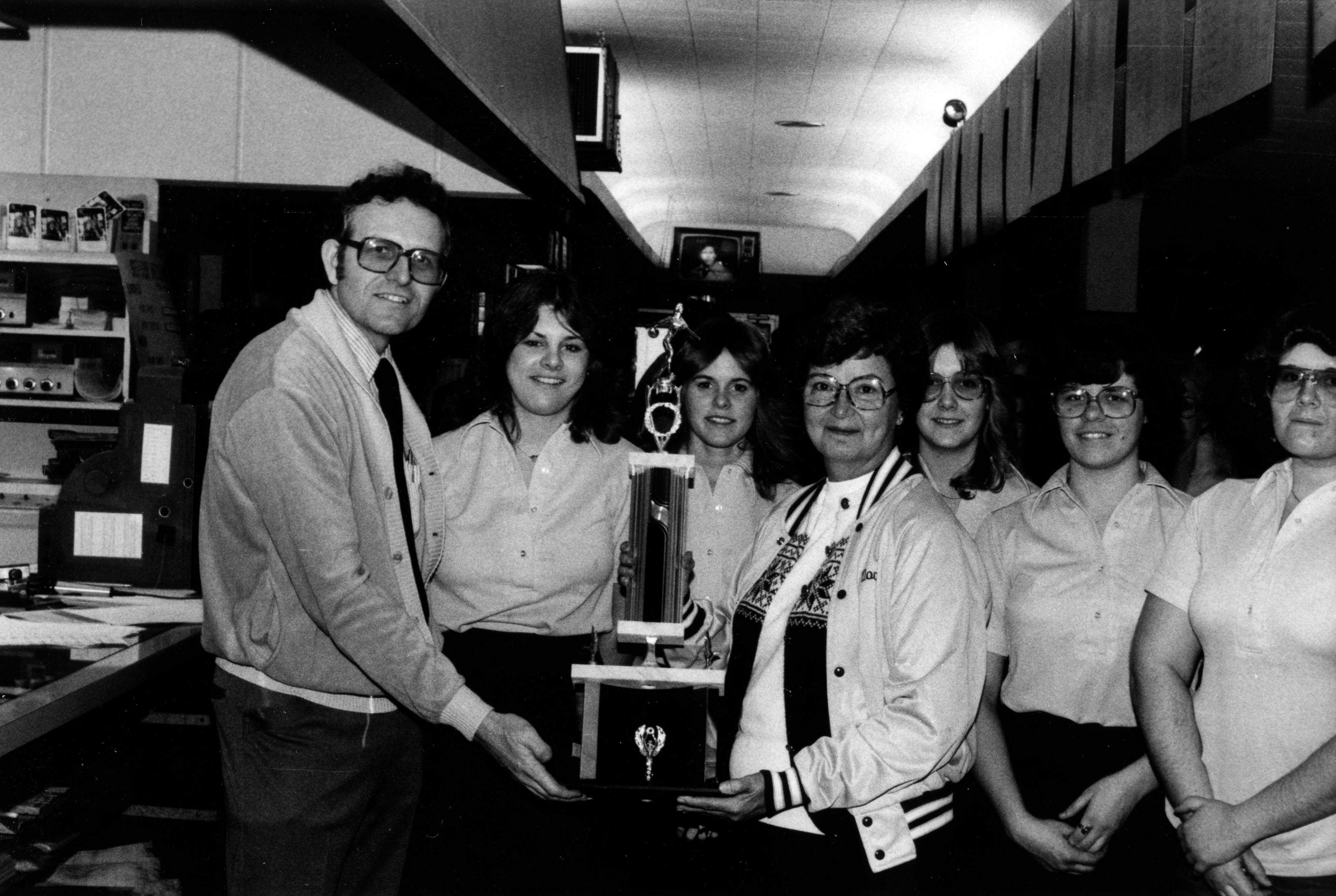 Dr. Donald Pitzer, the faculty advisor of women's bowling, and unidentified student athletes