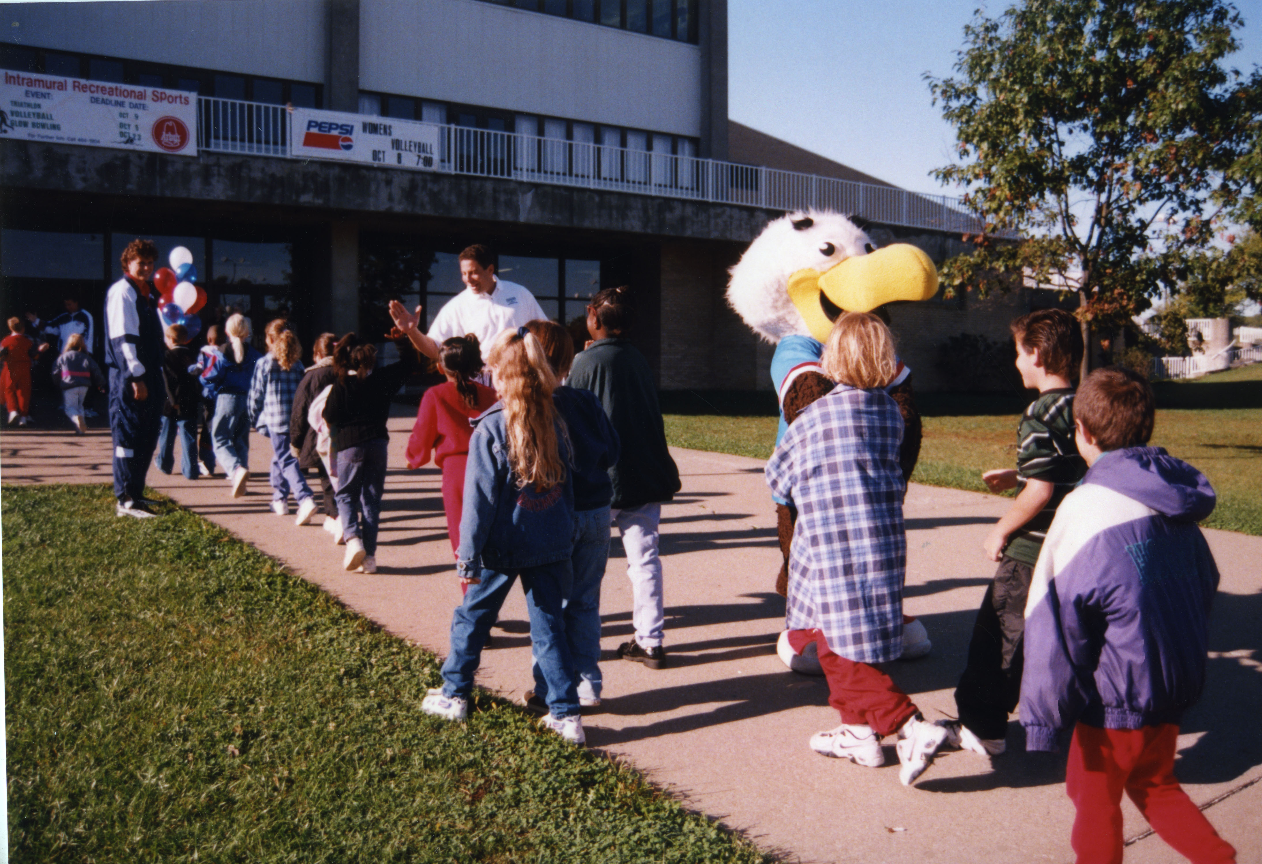 USI mascot Archibald Eagle and Basketball Coaches Bruce Pearl and Chance Dugan with Elementary Students